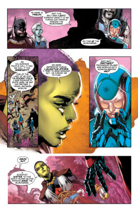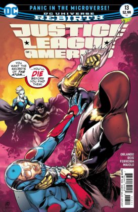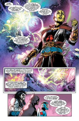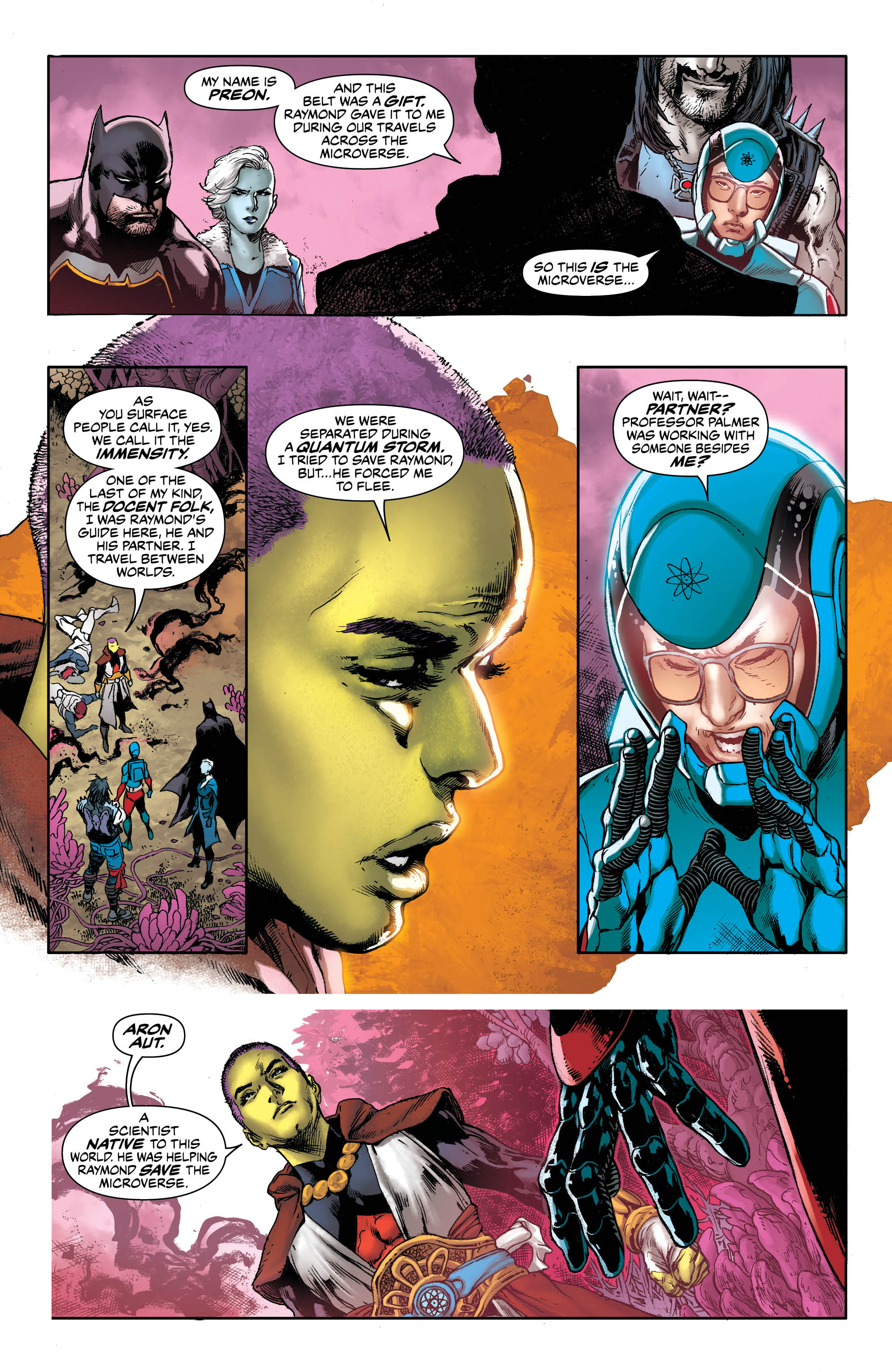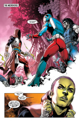 “CRISIS IN THE MICROVERSE” part two! Disaster strikes when the JLA’s shrink ship crashes on a strange world, where the team encounters a mysterious being who claims a connection to the missing Ray Palmer. But nobody’s going anywhere without the help of Shahn-Zi, a sentient planet with the power to find Palmer.