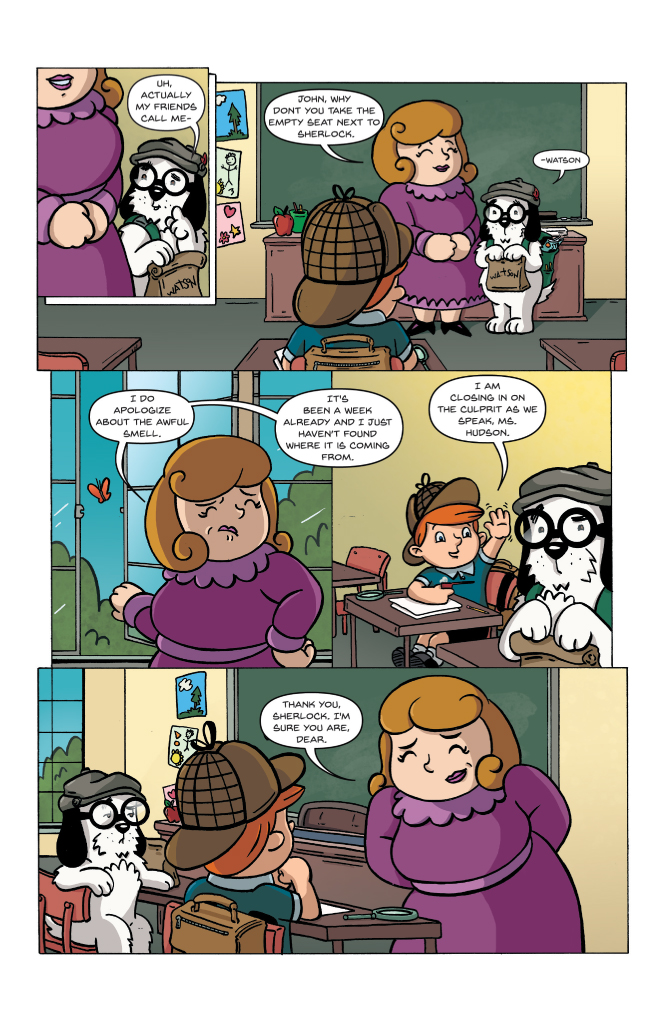 The series follows the adventures of Sherlock Holmes and his best friend, Watson the Dog, set in the halls of Baker Elementary. Together they deal with bullies, track down lost toys, investigate stolen playground equipment and even face an unseen threat terrorizing the school halls. All the while Watson struggles to make friends and Sherlock tries to understand his place at Baker Elementary. Included as well are interactive pages that will help fans, young and old alike, learn to make their own comic books and hone their investigate minds with puzzles and activities.
