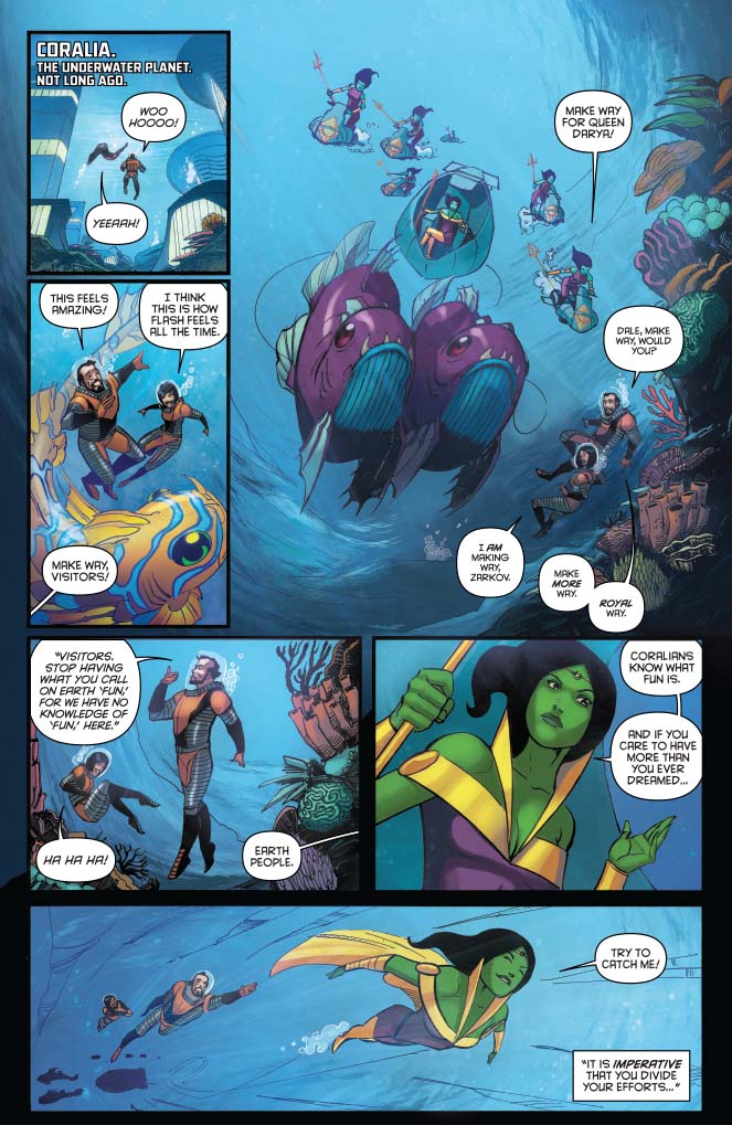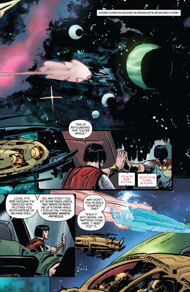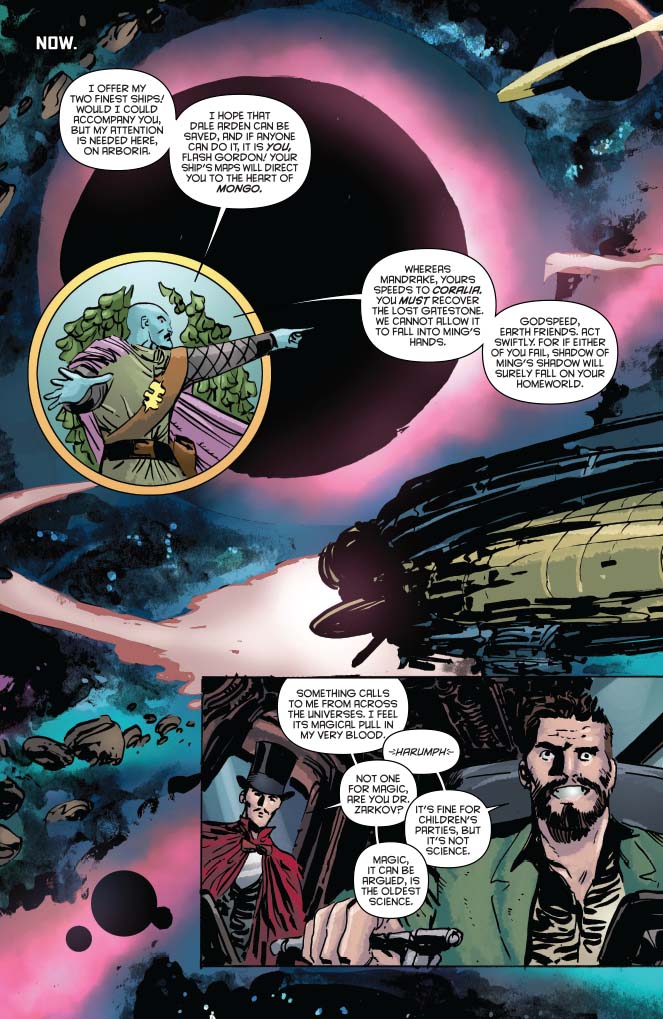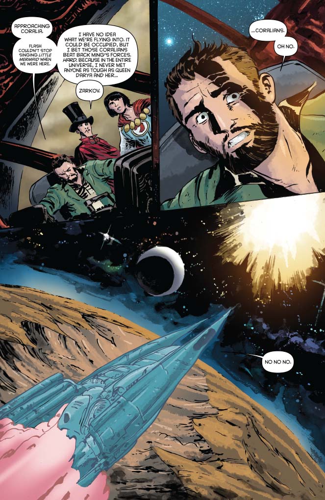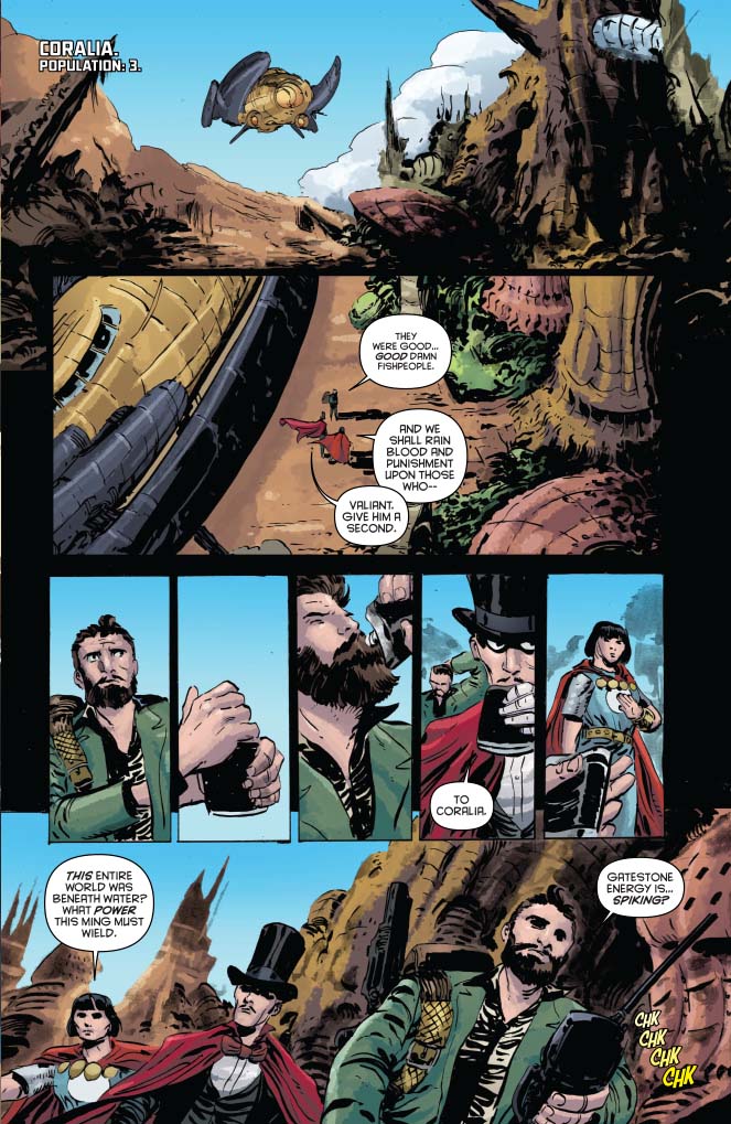 Bazillions of light years from Earth, our heroes split up! Mandrake the Magician and Prince Valiant face a barren planet of undead soldiers, as Flash Gordon, The Phantoms, and Jungle Jim plunge into the heart of Mongo to save damsel-in-distress Dale Arden! …Or, at least they think that’s what they’re doing!