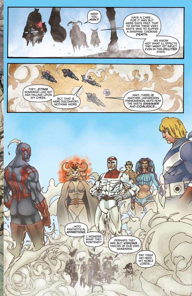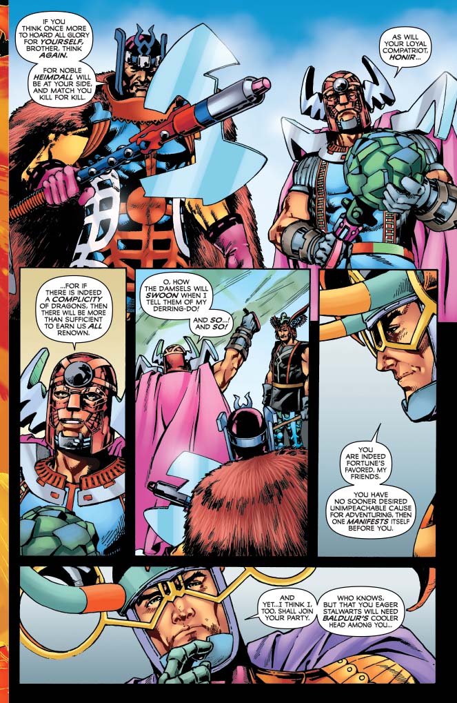Sigurd Dragonsbane, one of the greatest creations of legendary comic book writer/artist Jack “The King” Kirby, returns in an epic tale of valor and victory! When the Fell Mists, which have shrouded the borders of Valhalla for time immemorial, rise to expose other Mythlands beyond his own, Sigurd and his brethren Balduur, Honir, and Heimdall revel in the knowledge that they may once again ride abroad into unknown lands, lending arms to those in need. Tahmina, a princess imprisoned by fearsome dragons in distant Persia, sends a psychic projection to Valhalla, requesting their aid. Across strange summits and seas, they rush into adventure… facing witches, hulking beasts, and fiery she-demons along the way!