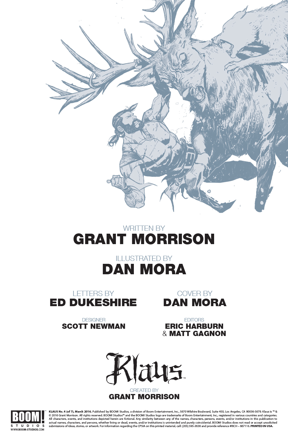 PreviewsBOOM! Studios Previews Klaus #4 By Comix Asylum - Mar 17, 2016 0 559 FacebookTwitterPinterestWhatsApp Klaus #4 Writer: Grant Morrison Artist: Dan Mora Klaus and Lady Dagmar’s romantic and tragic past is revealed. Klaus #4 1 of 7
