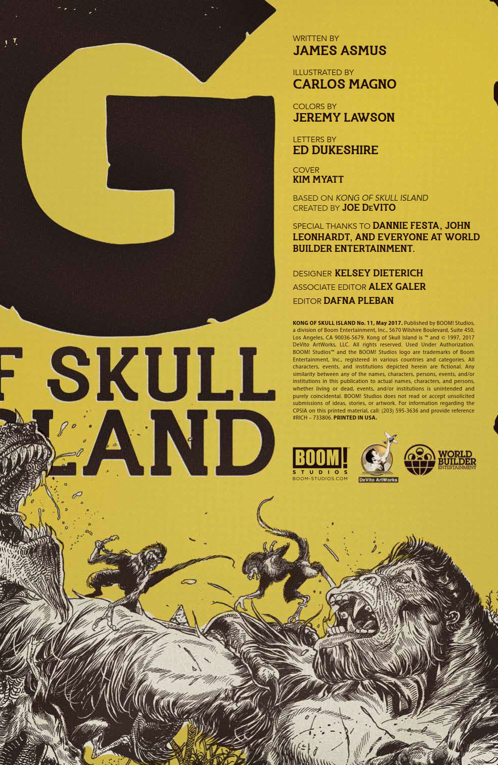 PreviewsBOOM! Studios Previews KONG OF SKULL ISLAND #11 By Comix Asylum - May 13, 2017 0 677 FacebookTwitterPinterestWhatsApp Kong of Skull Island #11 Publisher: BOOM! Studios Writer: James Asmus Artist: Carlos Magno Cover Artist: Kim Myatt Price: $3.99 Synopsis: Penultimate issue! The corruption within will be revealed, as the island’s Kongs are made feral. KONG OF SKULL ISLAND #11 1 of 7