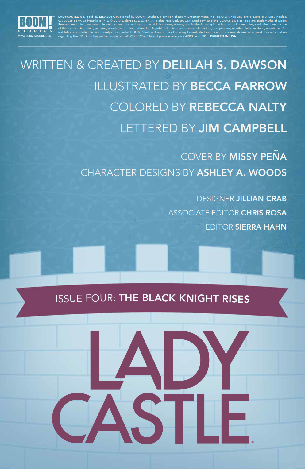 PreviewsBOOM! Studios Previews LADYCASTLE #4 By Comix Asylum - May 26, 2017 0 810 FacebookTwitterPinterestWhatsApp Ladycastle #4 Publisher: BOOM! Studios Writer: Delilah S. Dawson Artist: Becca Farrow Cover Artist: Missy Peña Price: $3.99 Synopsis: Final issue! In order to free Gwyneff from an evil knight, a champion must win three challenges! Ladycastle #4 1 of 7