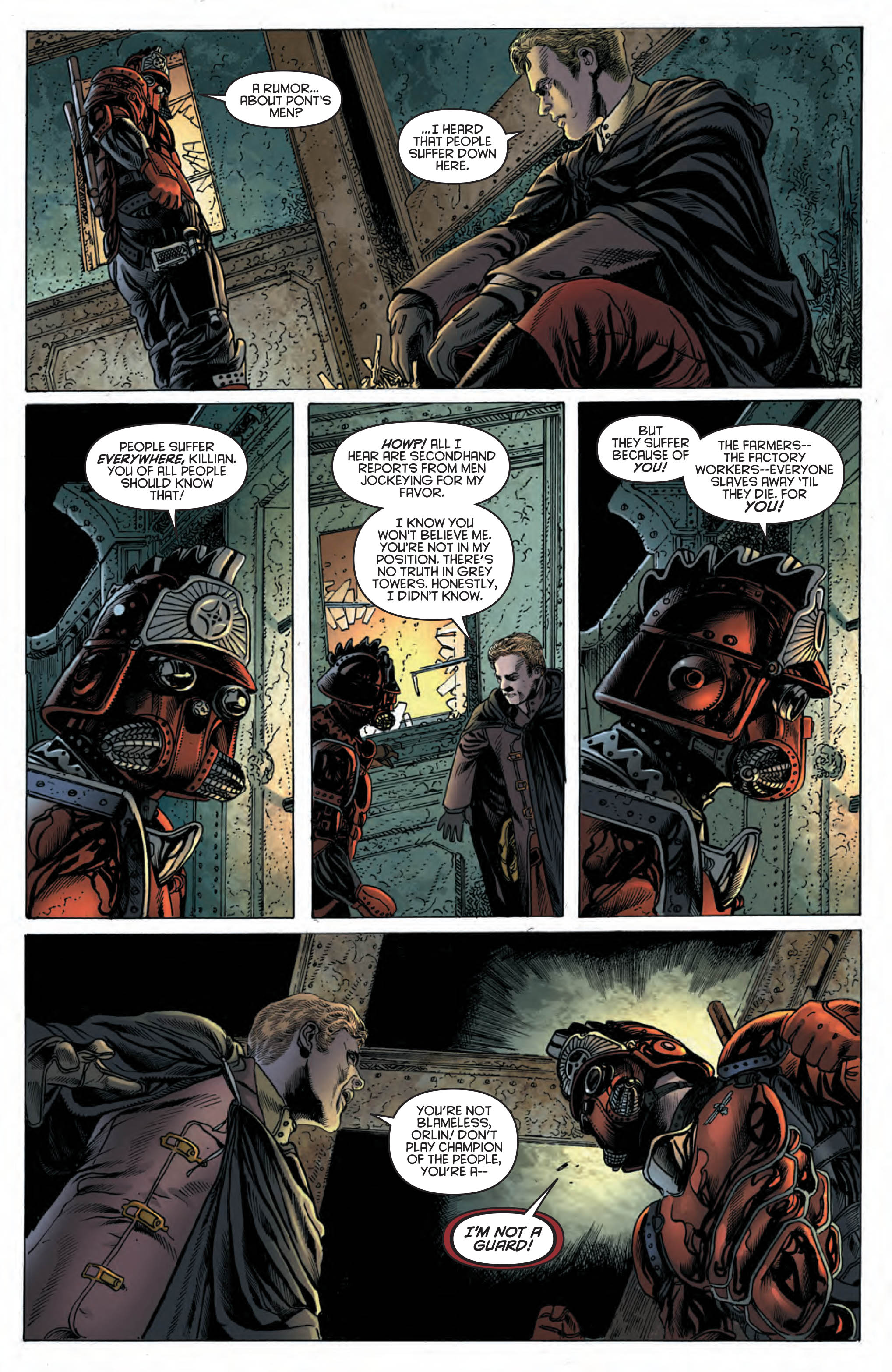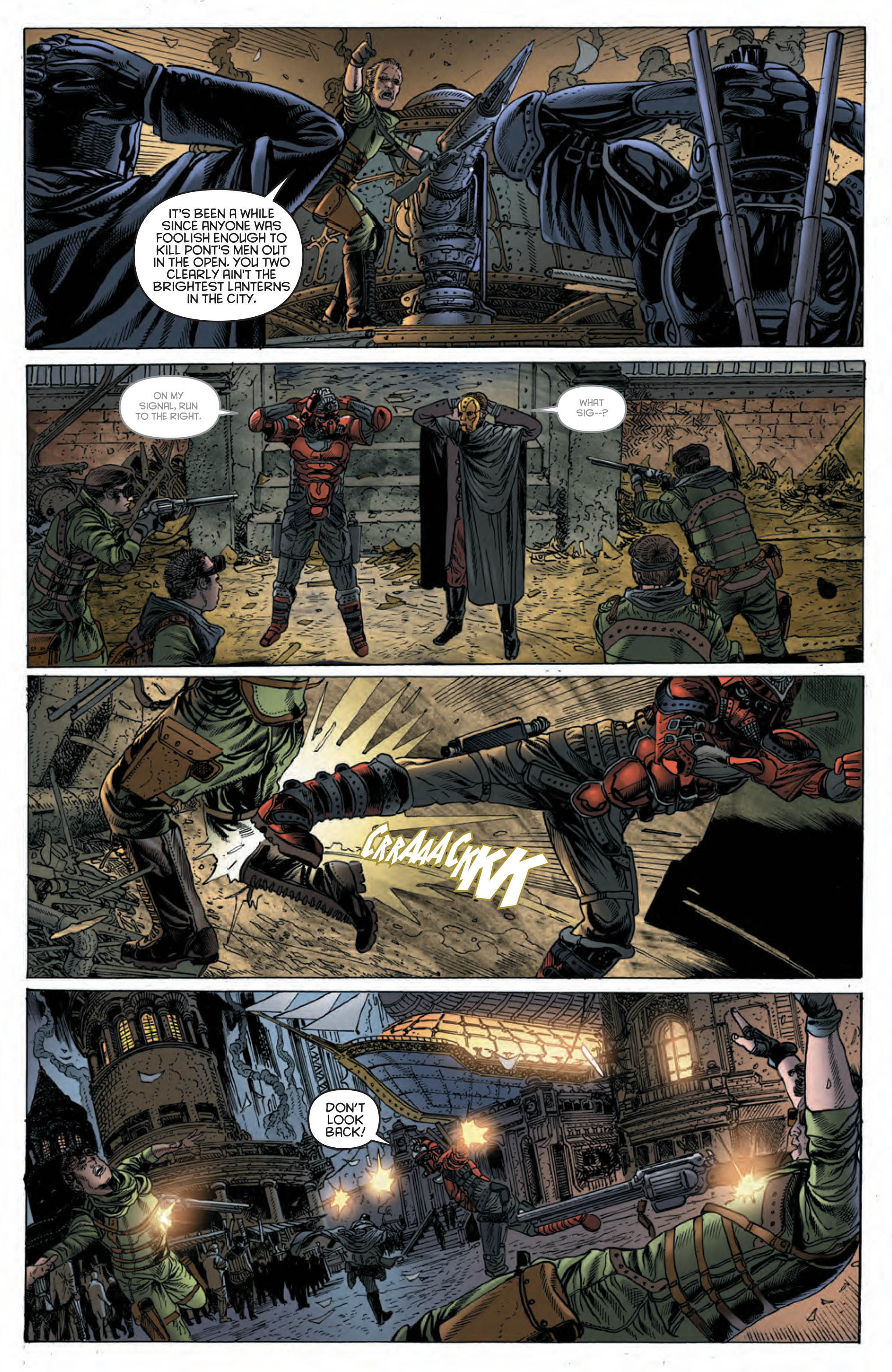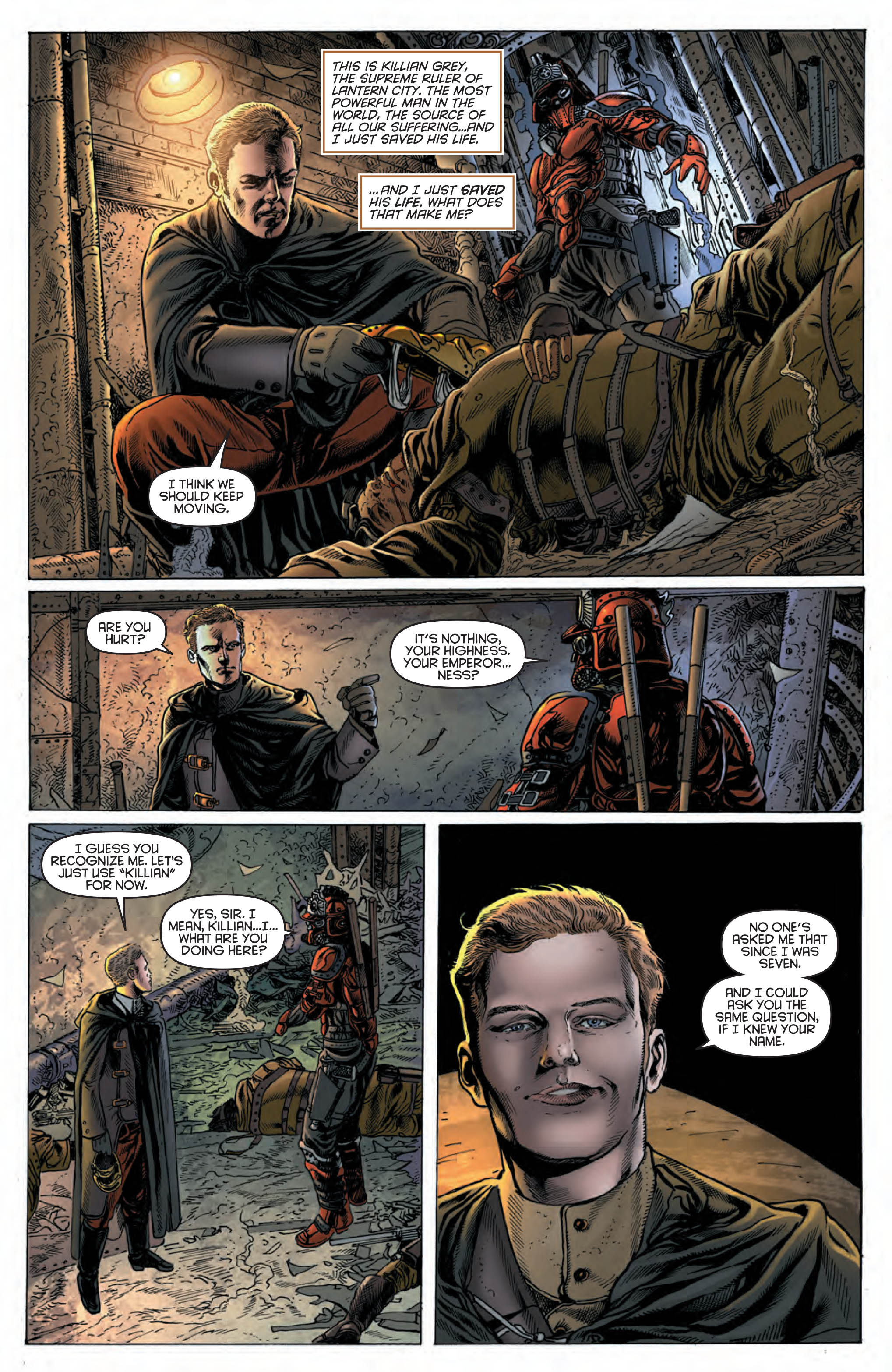 Synopsis: Sander Jorve thought that infiltrating the brutal Guard of Lantern City would help his family and his cause. He was wrong. After a chance run-in with the Emperor of the city, Killian Grey, Sander finds himself promoted to the Grey Guard, working directly under Killian in the heights of Grey Towers. The luxury is unparalleled, but can Killian be trusted? Can Sander trust himself? Nowhere in Lantern City is safe…and the imperial court may just be the most dangerous place of all. Collects issues #5-8 of the steampunk epic.