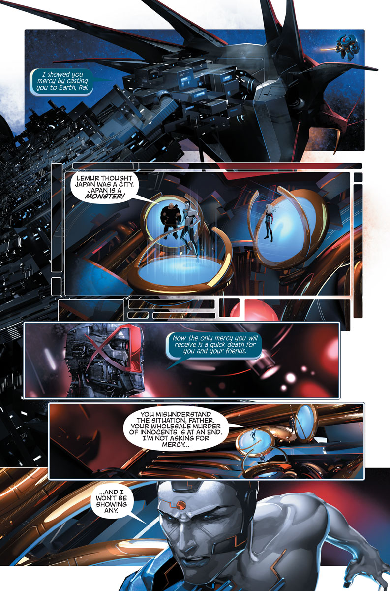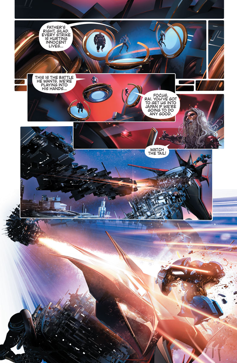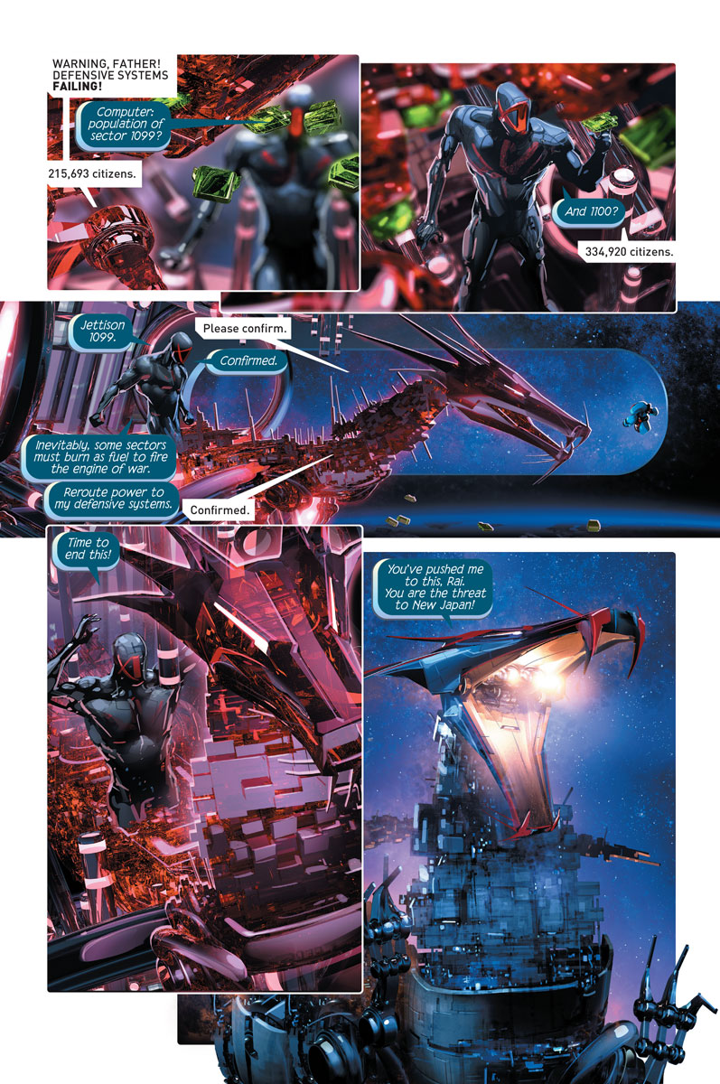 Rai is smashing headfirst into New Japan with his team of hardened rebels including the Eternal Warrior and a giant X-O Manowar mech-armor that’s been dormant for centuries! But when Father transforms New Japan into an impenetrable space dragon as a defense of last resort, what hopes will the united heroes of 4001 A.D. have of freeing the citizens of New Japan from Father’s brutal reign? Will Rai have to destroy New Japan…to save it?