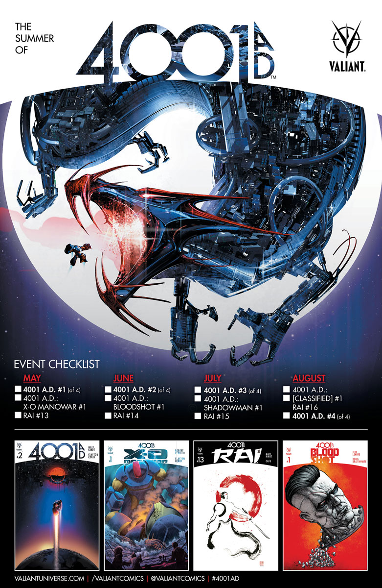 Plus: “THE SUMMER OF 4001 A.D.” escalates even further as a staggering cast of superstar talents come aboard to reveal what the 41st century holds for Valiant’s most iconic heroes in a new series of four indispensable one-shots! Featuring X-O Manowar, Bloodshot, Shadowman, and the debut of an all-new, top-secret character with a crucial tie to the present and future of the Valiant Universe, “THE SUMMER OF 4001 A.D.” erupts into full force here with four new chapters from Valiant’s most acclaimed creators, ripped directly from the pages of 4001 A.D.: