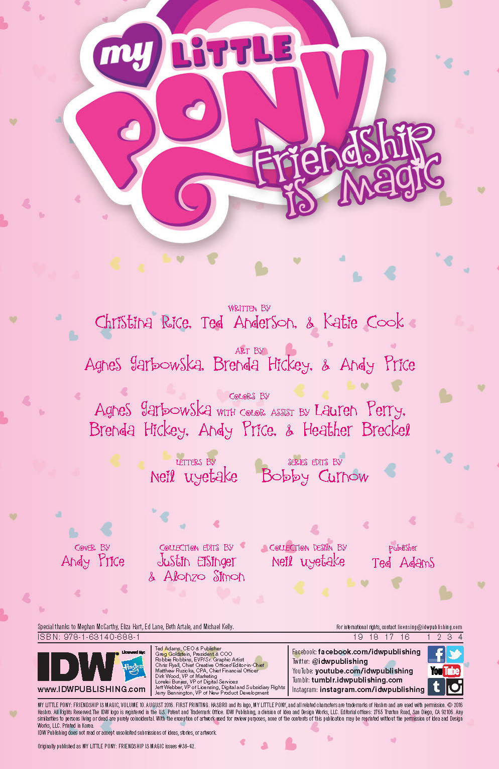 There’s never a dull moment in Ponyville! The Cutiemark Crusaders hit the great outdoors with their class! Find out about the untold first meeting of Twilight and baby Spike! Rainbow Dash’s grumpy mood starts to affect her friends. And, Pinkie Pie decides to make her very own comic book! Collects issues #38–42.