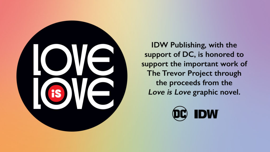 SAN DIEGO, CA (December 3, 2018) – IDW Publishing, with the support of DC, is proud to report that Love Is Love, the impactful graphic novel anthology published as a response to Orlando’s Pulse nightclub tragedy, has raised over $51,000 for this year’s charity recipient: The Trevor Project, the world’s largest suicide prevention and crisis intervention organization for LGBTQ young people.