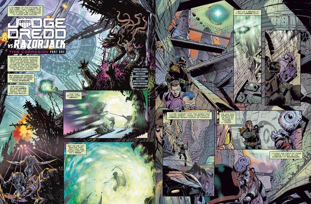 Michael Carroll said: “Judge Dredd versus Razorjack has been a dream project for a long time. I think John and I began talking about it even before I’d started working in comics, so seeing it come to fruition is incredibly satisfying. I’ve known John for the best part of two decades now: I reckon I’ve got a good handle on what he likes to draw — plus he’s not shy about *telling* me, which saves time! With the script for This Corrosion I tried to go for a sort of mid-‘80s Metal Hurlant approach; dark, visceral, intense and relentless, and John and Sally are clearly more than equal to the task: they’ve produced some of the best comic-book art I have ever seen. It’s striking, beautifully nightmarish, unforgettable, and in some cases just plain nasty — just the way we like it!”