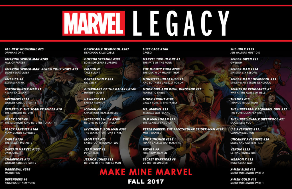 New York, NY—June 30, 2017 — You demanded it, we listened! Beginning this fall, prepare for an exciting new initiative that spans the entire Marvel Universe! Every hero! Every title! Every story! Honoring the past while proudly moving towards the future, MARVEL LEGACY will offer fans, both current and new, a renewed sense of hope, heroics, and dozens and dozens of returns of the heroes fans have been demanding! MARVEL LEGACY ushers in the next few years’ worth of stories from Marvel with everything fans could want and more. You asked for it, and now is the time to Make Mine Marvel!