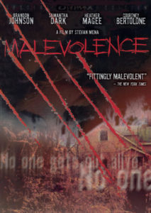 The first in the series is simply called Malevolence with the subtitle “No one gets out alive.” The film starts back on May 14th, 1989 where a six year old has been abducted. His face was marred by his captor as he watches him cut up a young woman in a farmhouse basement. Ten years later on September 20th, 1999 four people, Max, Kurt, Julian and Marylin are about to pull off a bank job but as the heist goes on things begin to fall apart. Max dies during the robbery as he is shot by a guard and the rest make their way to an abandoned house to meet up and divy up the cash. However, it seems that this house is not abandoned and without giving anything else away all I can say is that the bank robbers need to fend off someone else who wants to do them harm. This was a great start to the series and was shot on a very small budget however, it still delivers on all fronts.
