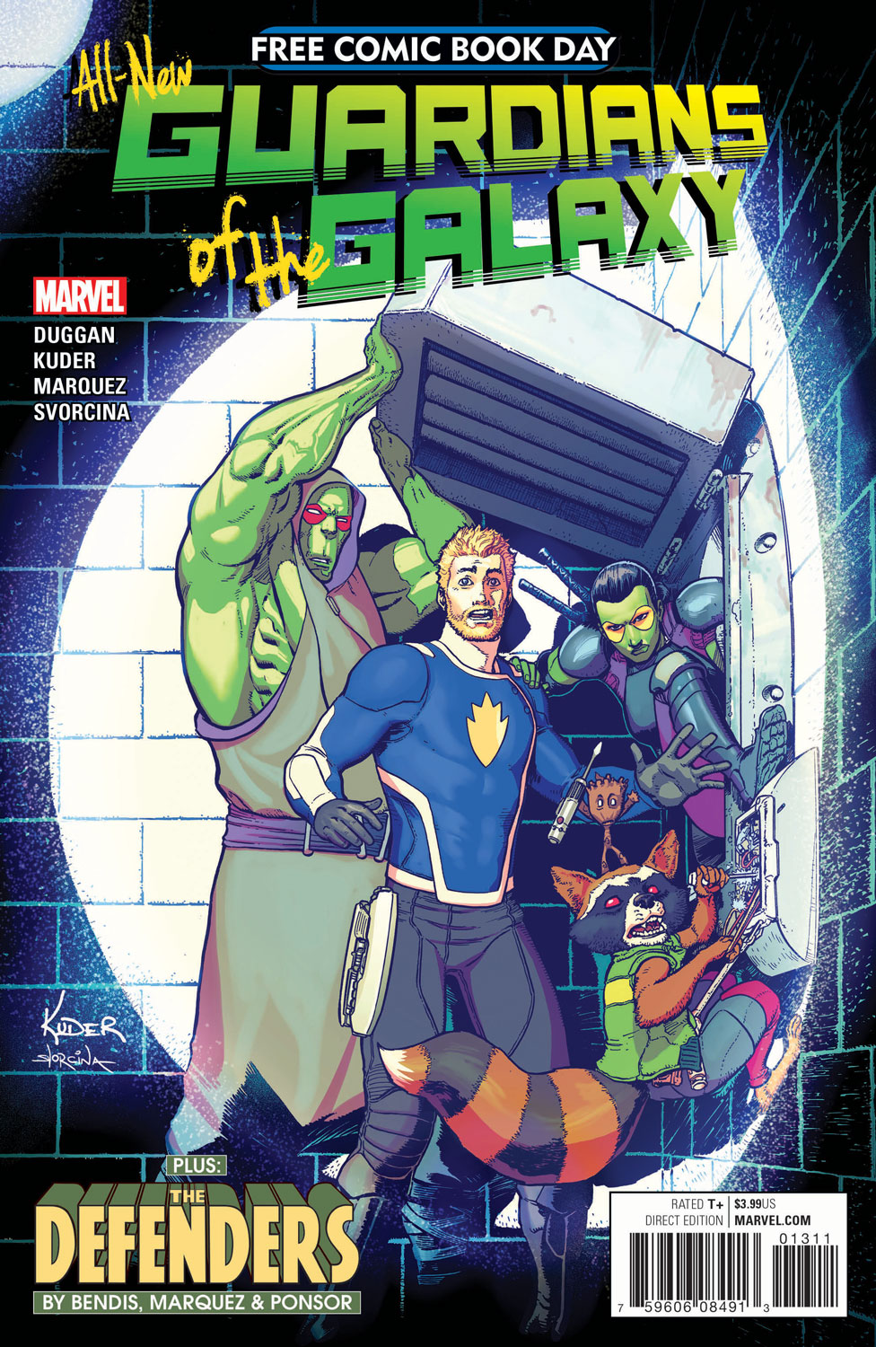 Then, blast off as Gerry Duggan, Aaron Kuder and Ive Svorcina bring you over-the-top action and out-of-this-world adventure in ALL-NEW GUARDIANS OF THE GALAXY #1 FCBD! Star-Lord, Drax, Gamora, Rocket Raccoon and Groot head back to the stars just in time for their new ongoing series! That is, if they survive a run in with the new Nova Corps! Finally, head back down to the mean streets of Hell’s Kitchen as Brian Michael Bendis, David Marquez and Justin Ponsor bring you a look inside THE DEFENDERS! Daredevil, Jessica Jones, Luke Cage and Iron Fist unite as they go head-to-head with a new criminal element in the Marvel Universe!