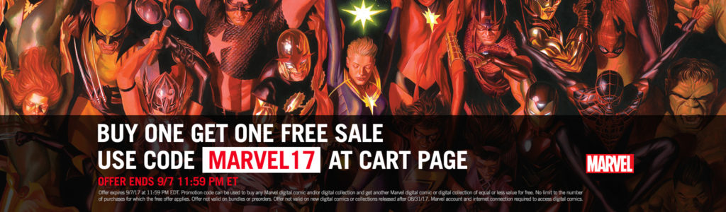 *Offer valid until 9/7/17 11:59 PM EDT on Marvel digital comics and collections only. Promotion code can be used to buy any Marvel digital comic and/or digital collection and get another Marvel digital comic or digital collection of equal or lesser value for free. No limit to the number of purchases for which the free offer applies. Offer not valid on bundles or preorders. Marvel user account and internet connection required.