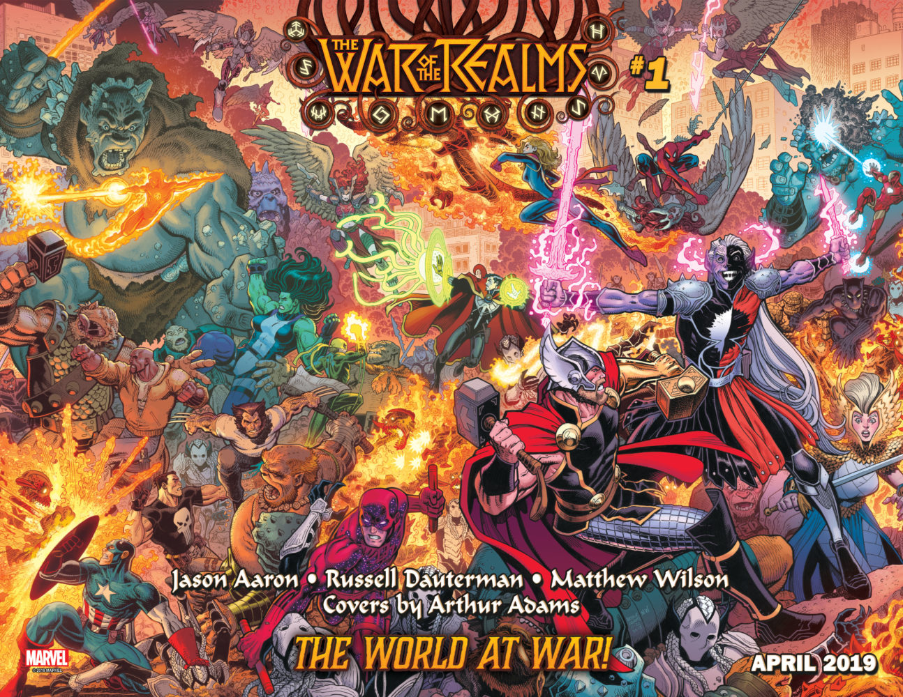 New York, NY—December 28, 2018— The War of the Realms has made Earth its battlefield! This April, one of the largest conflicts to engulf the Marvel Universe erupts in The War of the Realms – a new, epic crossover event from the award-winning creative team of Jason Aaron, Russell Dauterman, and Matthew Wilson, with covers by the legendary Arthur Adams! Marvel’s 2019 war-to-end-all wars must enlist every great Marvel Hero to save Earth…and beyond!