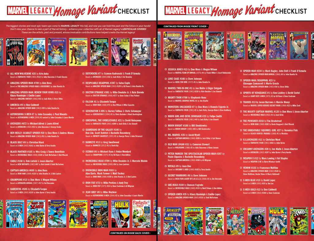 Need more MARVEL LEGACY? Visit Marvel’s hub for all things past, present and future at http://marvel.com/legacy and view creative teams, story arcs, solicits and more. And to help you make sure you collect all of your favorite titles starting this fall, Marvel is excited to provide fans with a checklist that will appear in the interior cover of all lenticular Homage Variants.