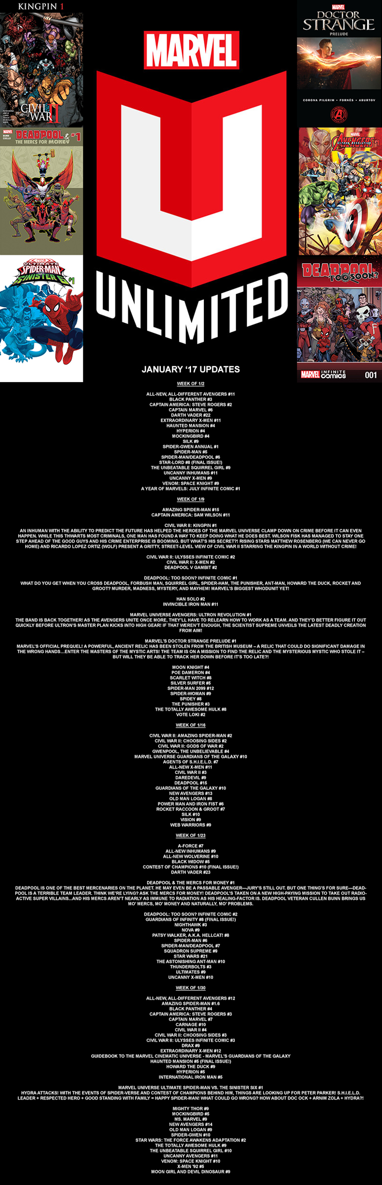 New York, NY— January 4th, 2017 – Marvel Unlimited, Marvel’s digital comics subscription service, offers members unlimited access to over 19,000 issues of Marvel’s classic and newer titles, delivered digitally through your desktop web browser and the Marvel Unlimited mobile app. With classic and newer issues added every week here are some of the amazing Marvel titles coming to Marvel Unlimited this January: