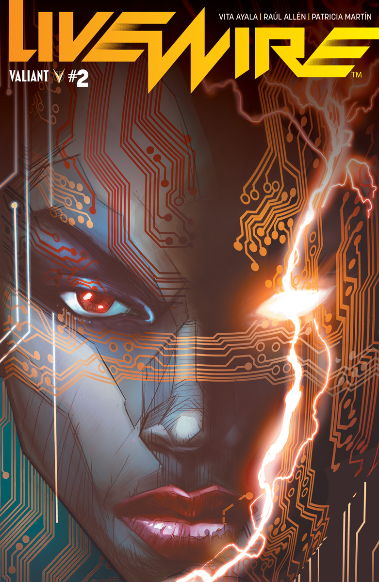 As first revealed at Newsarama, Valiant is proud to debut an advance look at a brand-new foe, Pan de Santos! Making their debut in LIVEWIRE #2 and designed by series artists Raúl Allén and Patricia Martín, writer Vita Ayala describes the upcoming antagonist as “the conceptual opposite of Livewire” and a “true believer of Toyo Harada.” Feast your eyes on the character design above and a color preview from LIVEWIRE #2 below!
