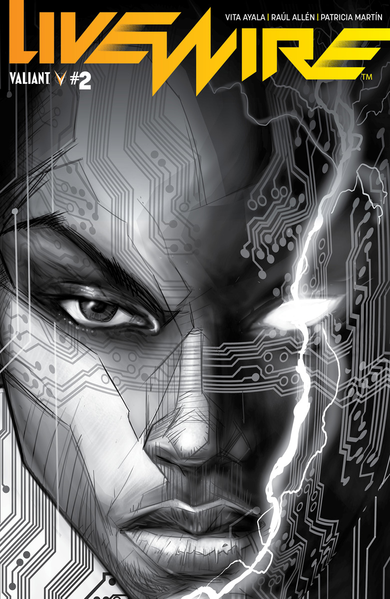 As first revealed at Newsarama, Valiant is proud to debut an advance look at a brand-new foe, Pan de Santos! Making their debut in LIVEWIRE #2 and designed by series artists Raúl Allén and Patricia Martín, writer Vita Ayala describes the upcoming antagonist as “the conceptual opposite of Livewire” and a “true believer of Toyo Harada.” Feast your eyes on the character design above and a color preview from LIVEWIRE #2 below!