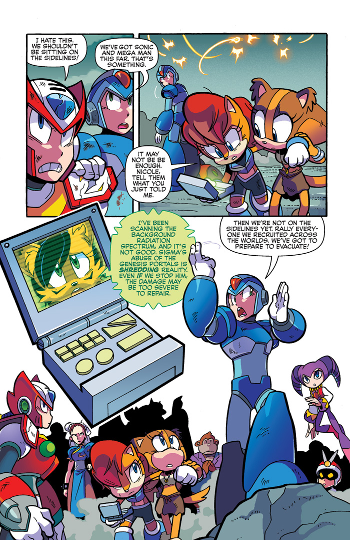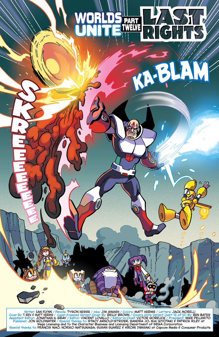 The ALL-NEW Sonic/Mega Man Crossover sequel comes to a chaotic close with “Worlds Unite” Part Twelve: The grand finale to “Worlds Unite” sees our super-powered heroes Sonic and Mega Man face off against the evil Sigma in his final, most lethal form! If that wasn’t enough, the Genesis Portal-ravaged reality is falling apart and time is running out to fix it! You don’t want to miss the stunning conclusion to the biggest crossover event of the year! Featuring the worlds of STREET FIGHTER, SKIES OF ARCADIA, NiGHTS INTO DREAMS, OKAMI, GHOSTS ‘N’ GOBLINS, ALEX KIDD and more! Featuring cover art from the legendary T.Rex, a special “SUPER-POWERED” variant by Reilly Brown and the final part of the epic 12-part connecting variant cover series by artist Ben Bates!