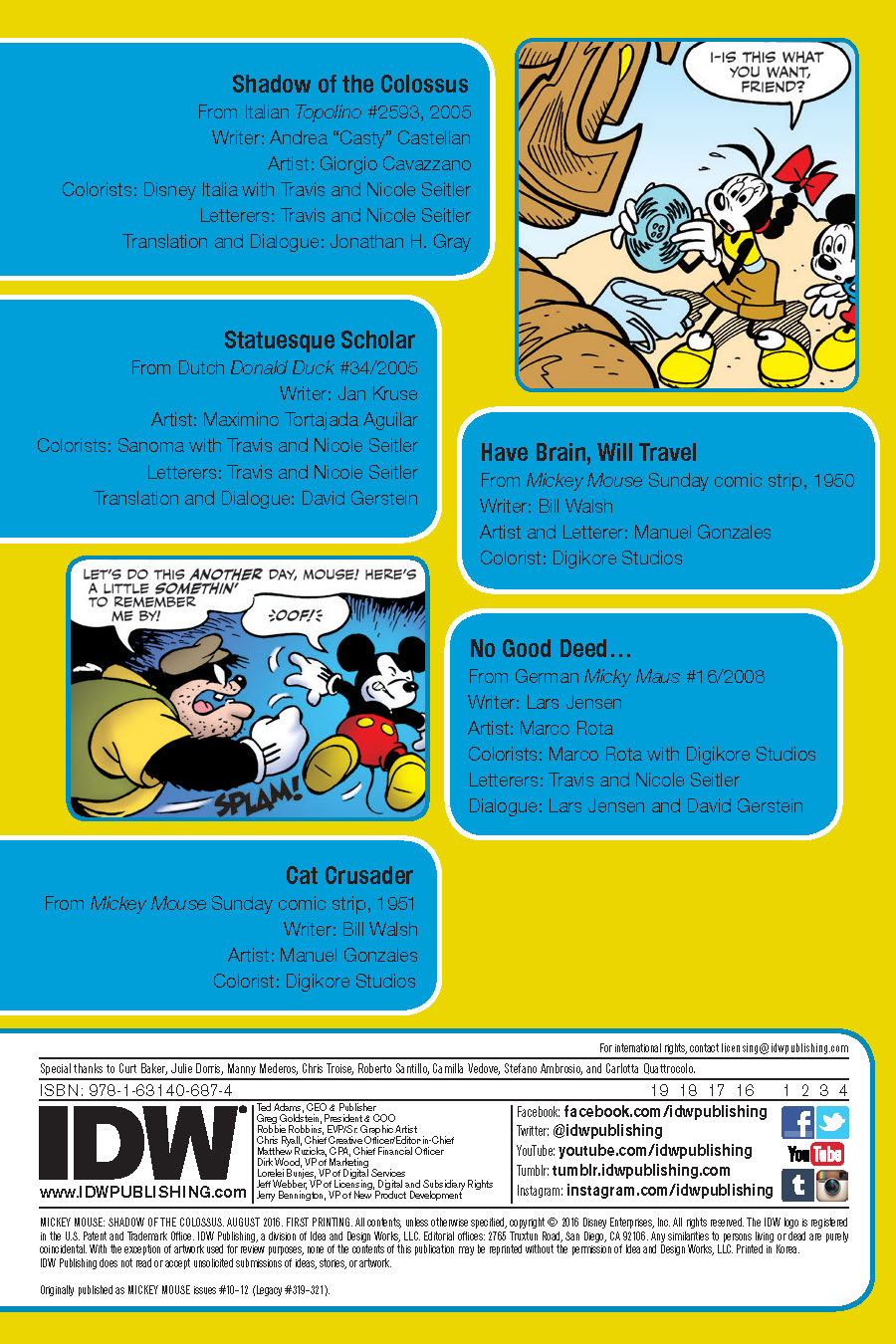 When a skyscraper-sized ancient Greek robot warrior comes to ferocious life, Mickey, Goofy, and Eurasia Toft might find their own lives at stake! Then, in “Bridge on the River Ai-Yai,” Mickey’s mynah bird pal, Ellsworth, drags him into a years-old battle with an infamous con man! Collects IDW’s Mickey Mouse #10–12.