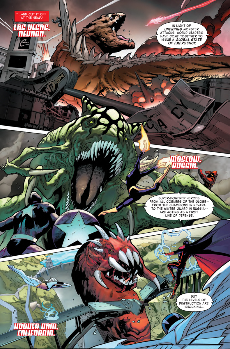“McNiven not only nails the giant monsters and widescreen action, he also draws perfect renditions of Marvel’s newer and older heroes.” – IGN