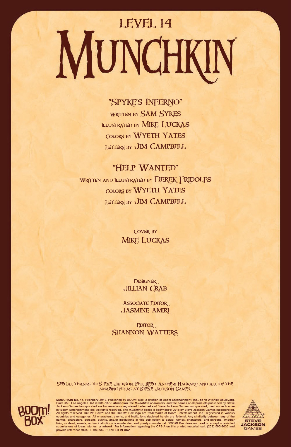 PreviewsBOOM! Studios Previews Munchkin #14 By Comix Asylum - Feb 23, 2016 0 578 FacebookTwitterPinterestWhatsApp Munchkin #14 Imprint: BOOM! Box Writers: Sam Sykes, Derek Fridolfs Artists: Mike Luckas, Derek Fridolfs Dungeons, and monsters, and loot…oh my! Munchkin #14 1 of 7
