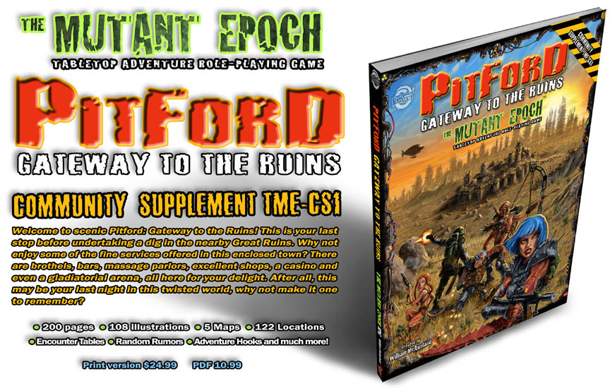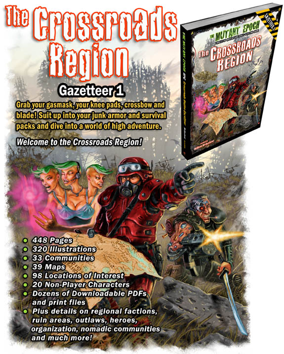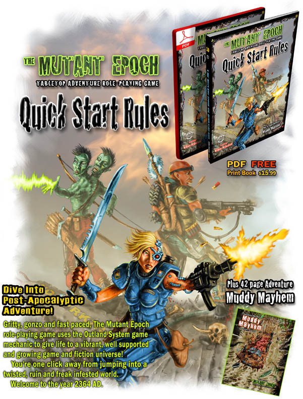 But don’t take my word alone for it there is a version of the Quick Start Rules that you can get 100% completely for free. Give this game a test drive and if you like it you can either purchase it in PDF form or in print as well. For more information on this game and the supplements for it head over to http://www.outlandarts.com/mutantepoch.htm and get ready to experience the wasteland.