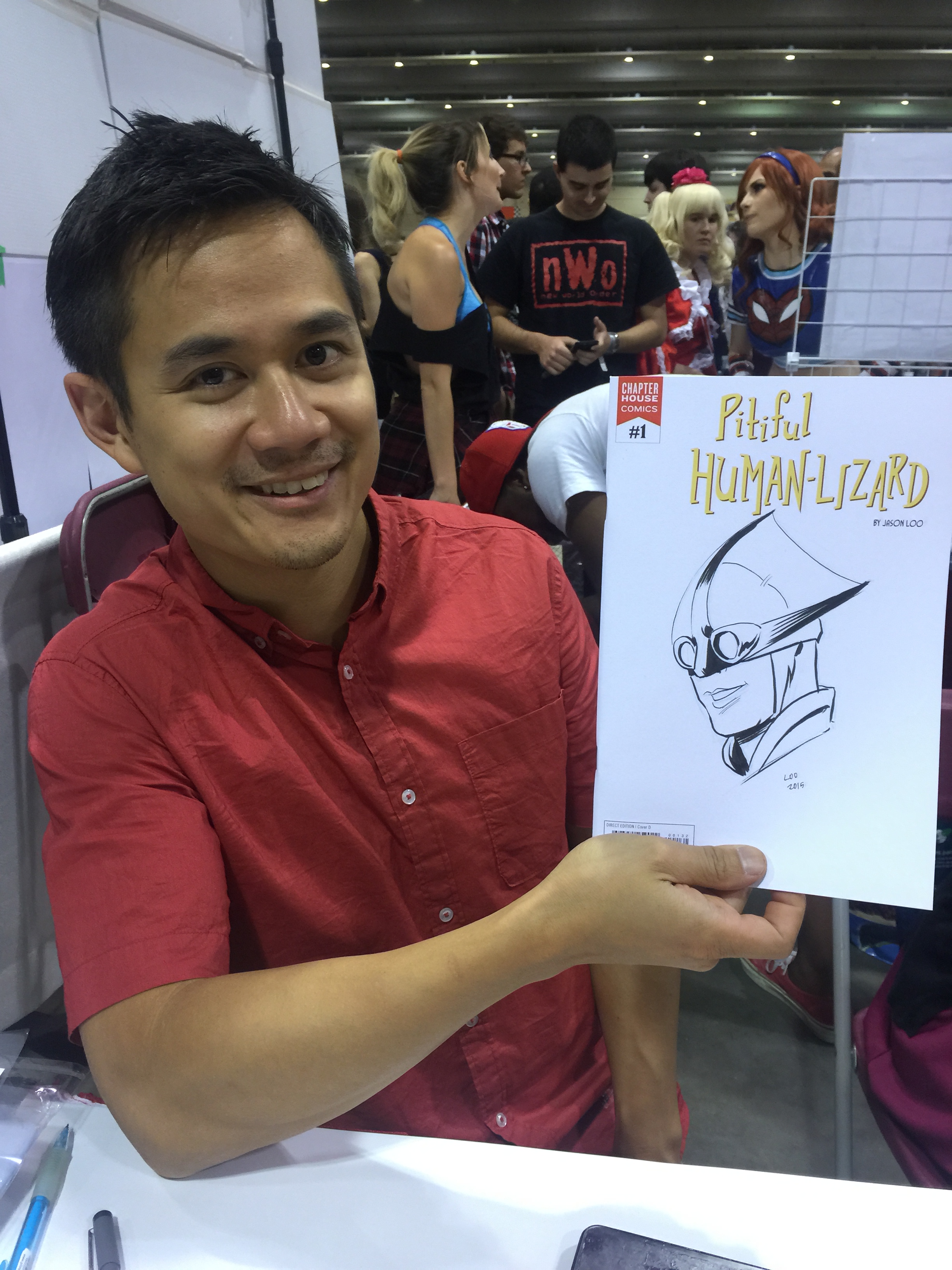 An up-and-coming Toronto man who is quickly gaining more recognition is Jason Loo: author, artist, and letterer of the T-Dot’s own pathetic superhero PITIFUL HUMAN-LIZARD. He has signed an exclusive contract with Chapter House Publishing and the first five issues of his series will be reprinted by them before number six comes out in February. I bought the latest ultra-rare mini-comic featuring a second serving of his other brainchild GRIZZLY BIKER. Aside from that, I bought the almost-impossible-to-get variant covers for PHL #1 — one blank and one featuring the CN Tower. He drew a head sketch of PHL for me 😀