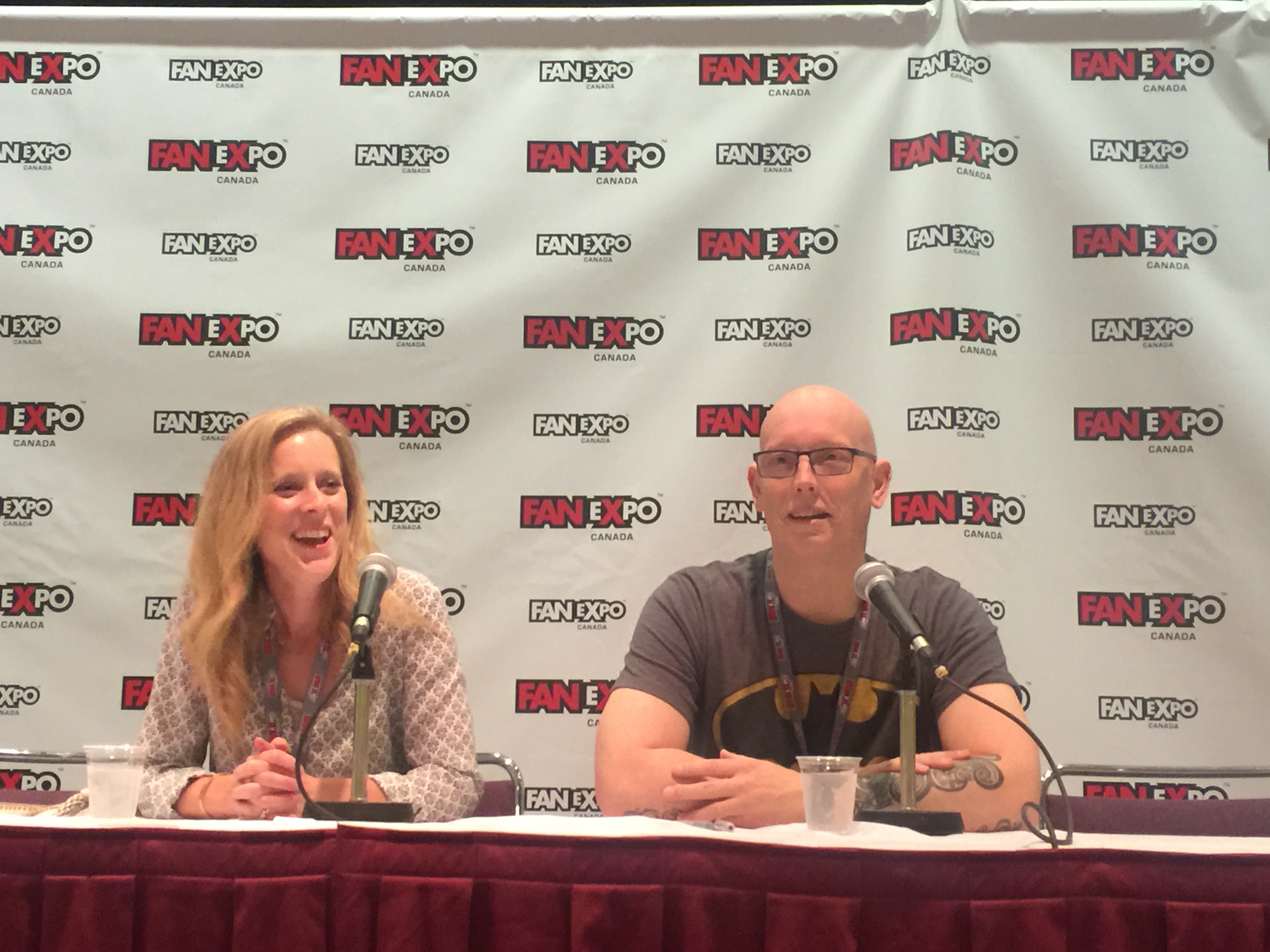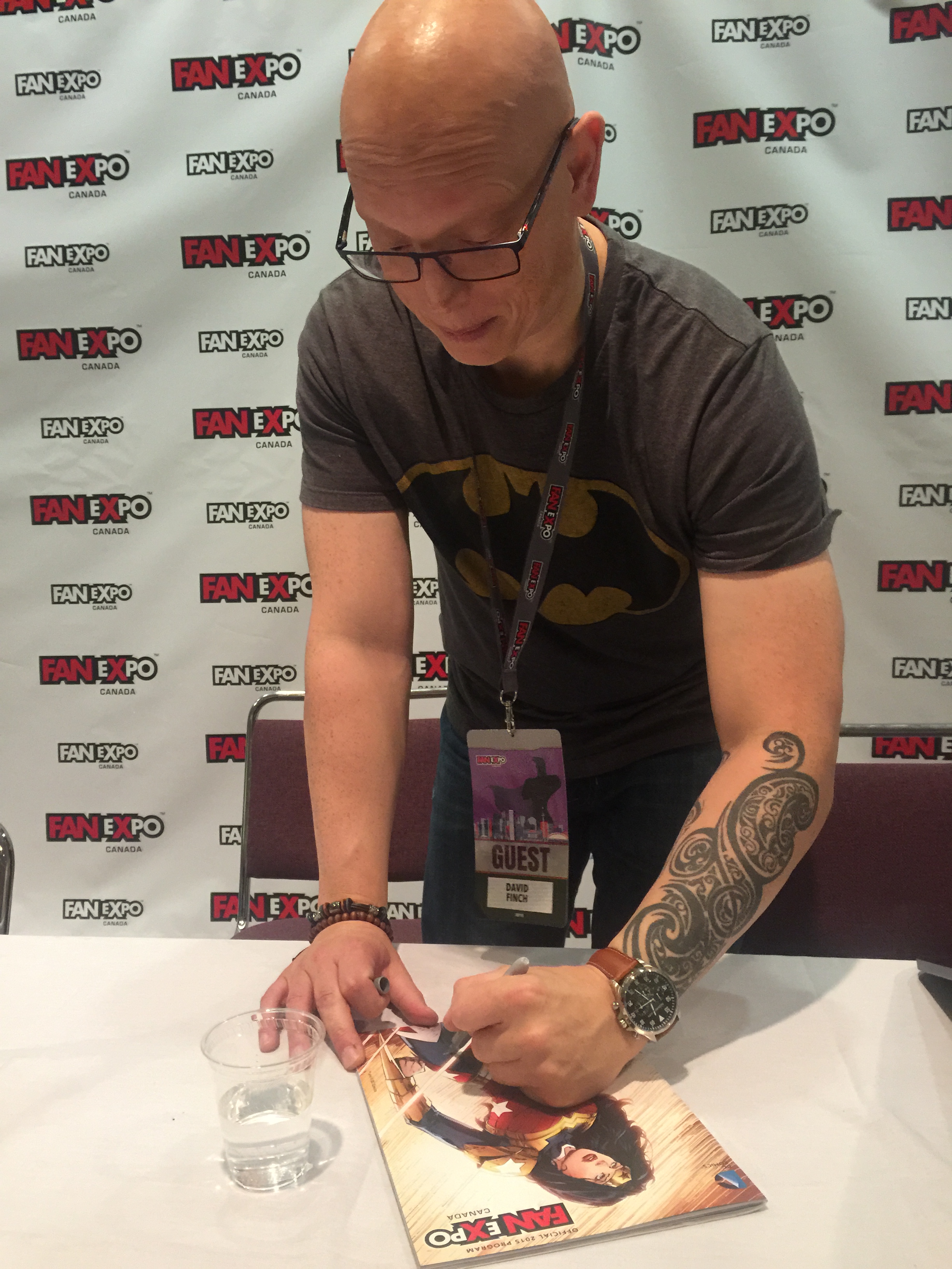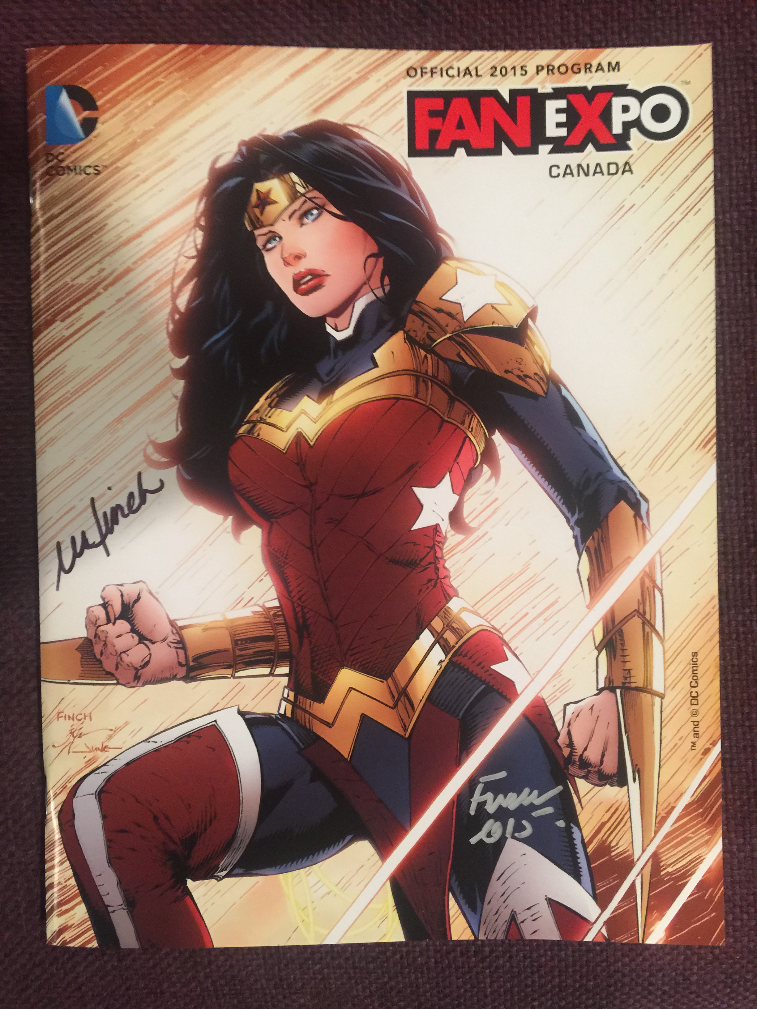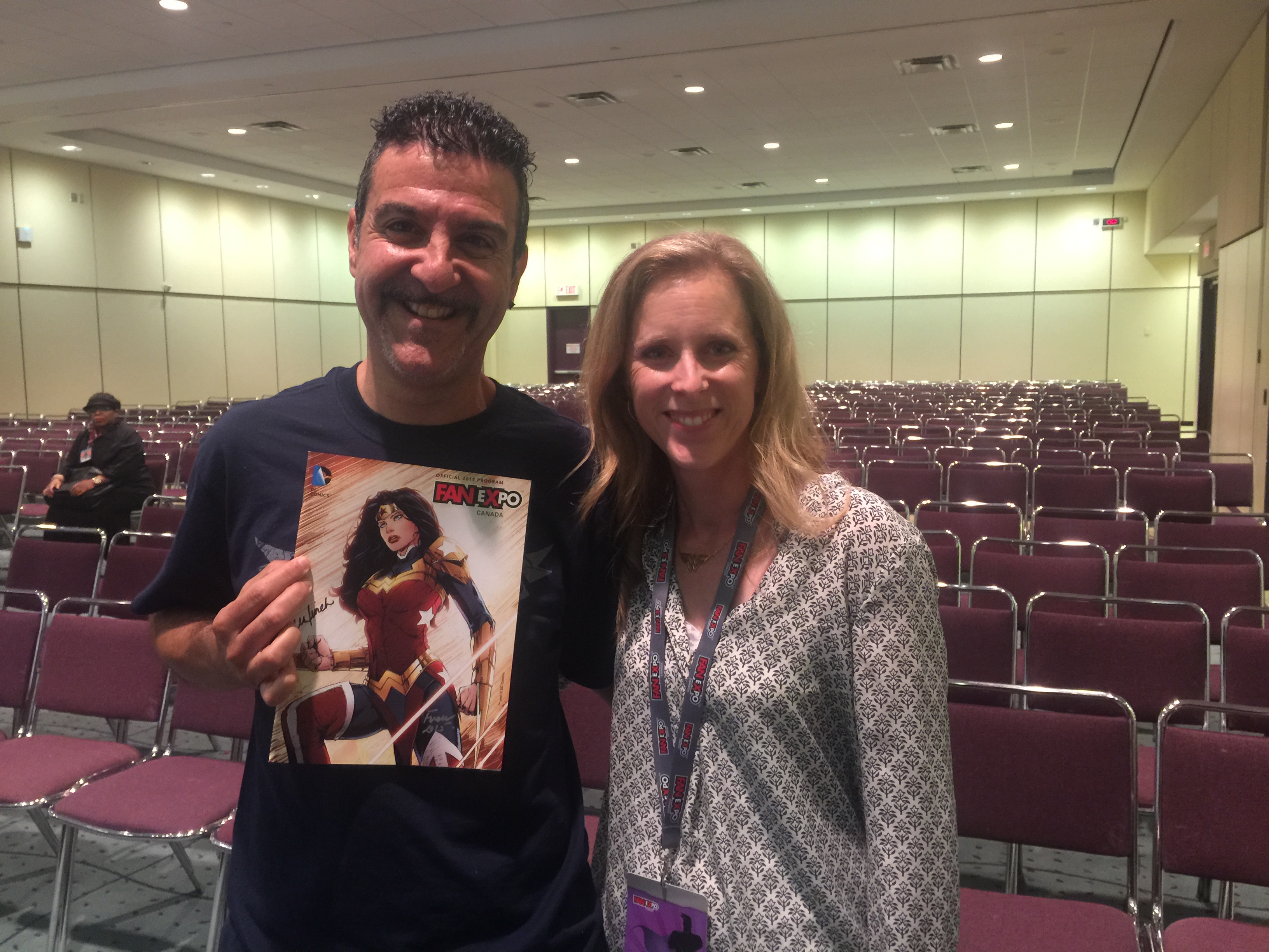 The highlight of the day was attending the DC Comics Panel spearheaded by power couple Meredith and David Finch, the current overseers of WONDER WOMAN!! Triple treat: two Canadians who are personal friends of the owner of Gotham Central, and my DC super-heroine number one. The wife-husband team were extremely entertaining, humorous, forthright, and a little too critical of themselves IMO. Lots of laughter throughout the sixty-minute session as well as heaps of honesty. When I approached them afterwards, I had them sign the variant FANeXpo program guide and posed with each of them. I’m confident to speak with them more in the near future.