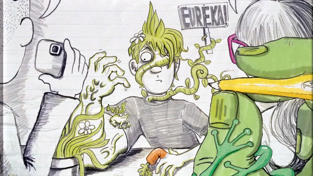 Okay, if you’re still there, here’s what we can share. On October 1, DC’s newest middle grade graphic novel, THE SECRET SPIRAL OF SWAMP KID, will be available in comic shops and book stores nationwide. Today, DC is giving fans a sneak peek into Swamp Kid’s journal with a brand-new trailer! Featuring middle schooler Russell Weinwright, an excessive doodler, and his best friends Charlotte and Preston, this swampy journal follows Russell’s hilarious journey as Swamp Kid.