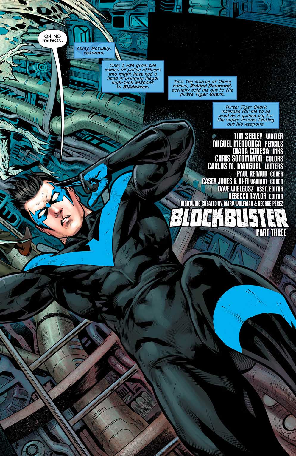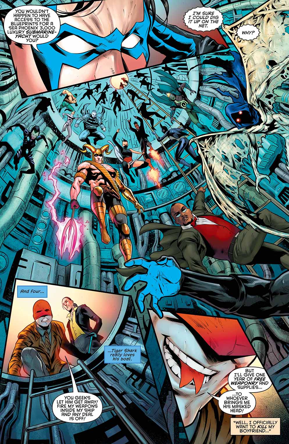 “BLOCKBUSTER” part three! Nightwing is trapped on a submarine, and in order to escape he must defeat the most lethal villains in the DCU, led by Tiger Shark! And if he can’t escape, Blockbuster will get what he wants: all of his criminal competition at the bottom of the sea, along with Nightwing!