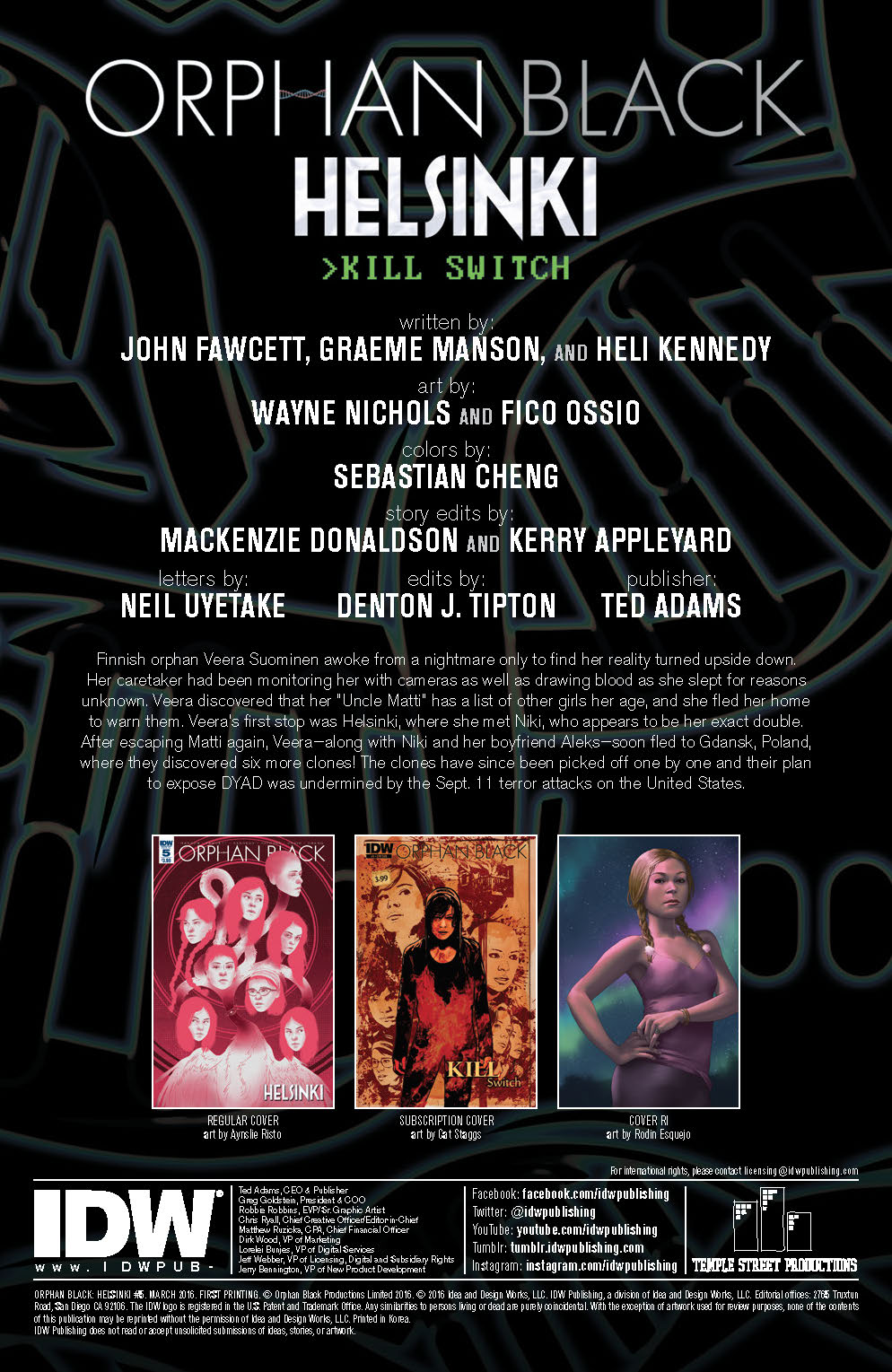 Helsinki. Spoken in hushed tones, the word means almost certain death for the clones of Project Leda. But find out here what it means to a very special clone named Veera. Learn the dark secrets of this codename in this special event miniseries by co-creators Graeme Manson and John Fawcett.