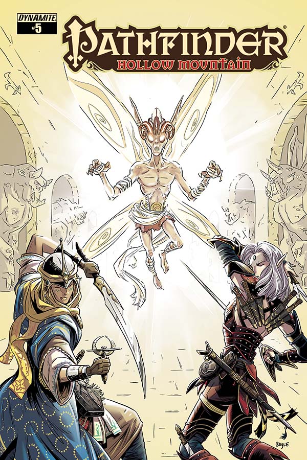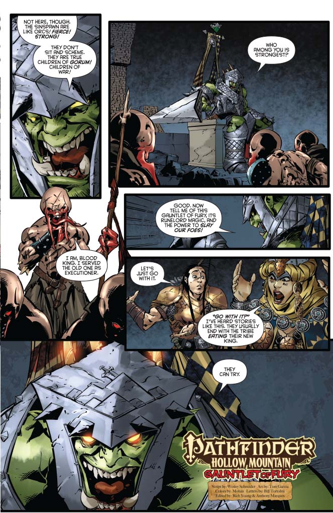 time for both heroes and villains to band together and destroy the demonic Castellan. Yet even when everyone’s lives are on the line, can Seltyiel and his band of mercenaries truly be trusted? Pathfinder: Hollow Mountain comes to a thrilling conclusion in this issue, written by Pathfinder co-creator James L. Sutter (Pathfinder Origins, The Redemption Engine) and drawn by rising star Tom Garcia (Mercy Thompson)!  Contains pull-out poster map andofficial Pathfinder RPG bonus encounter!
