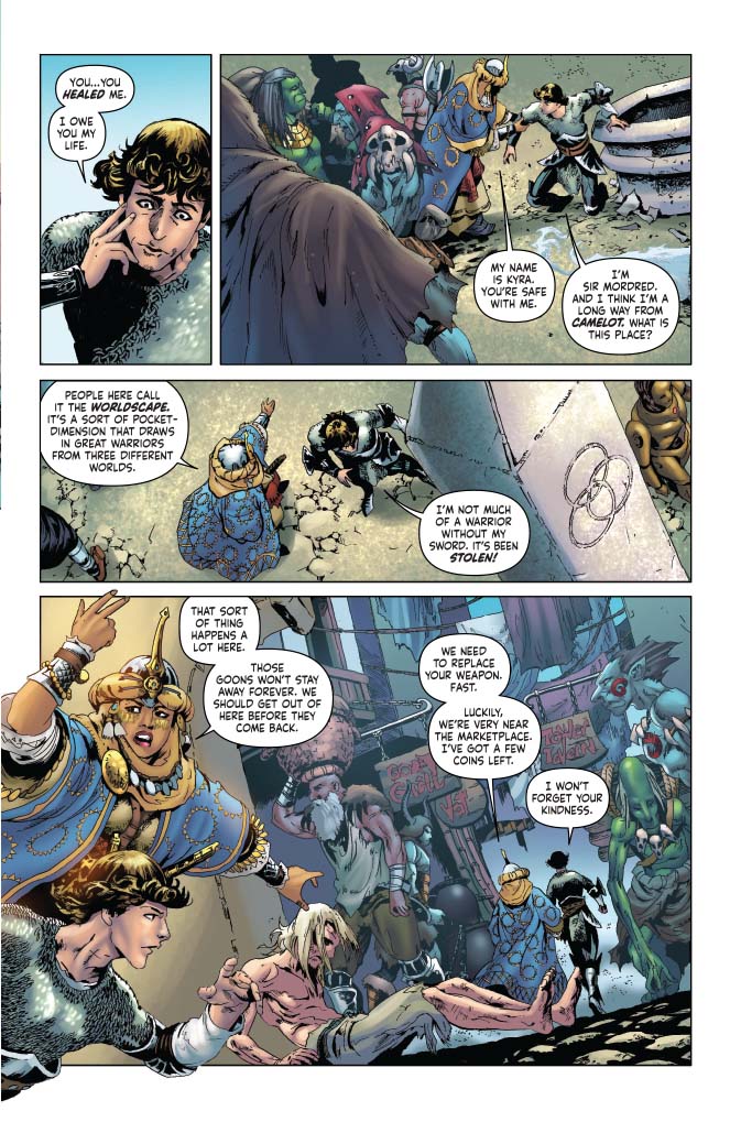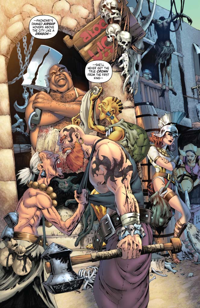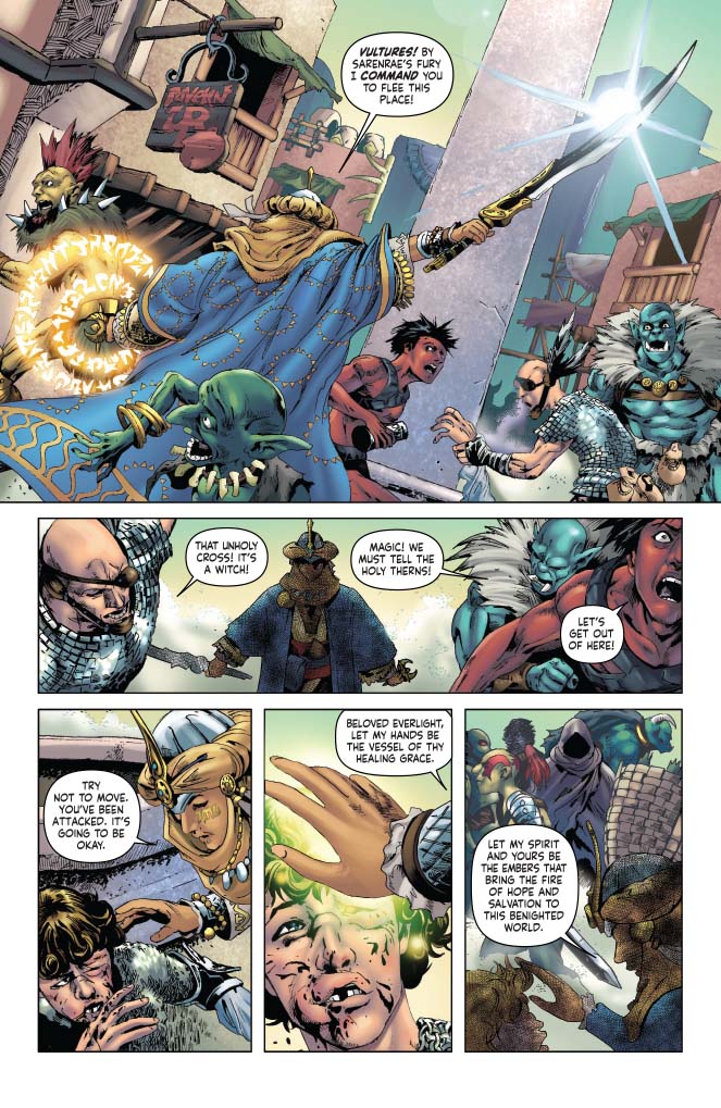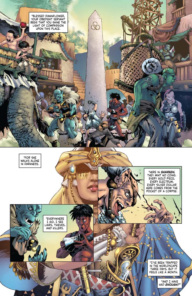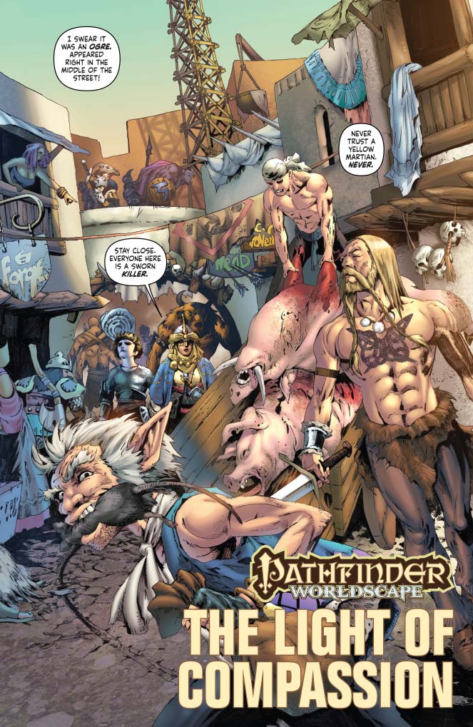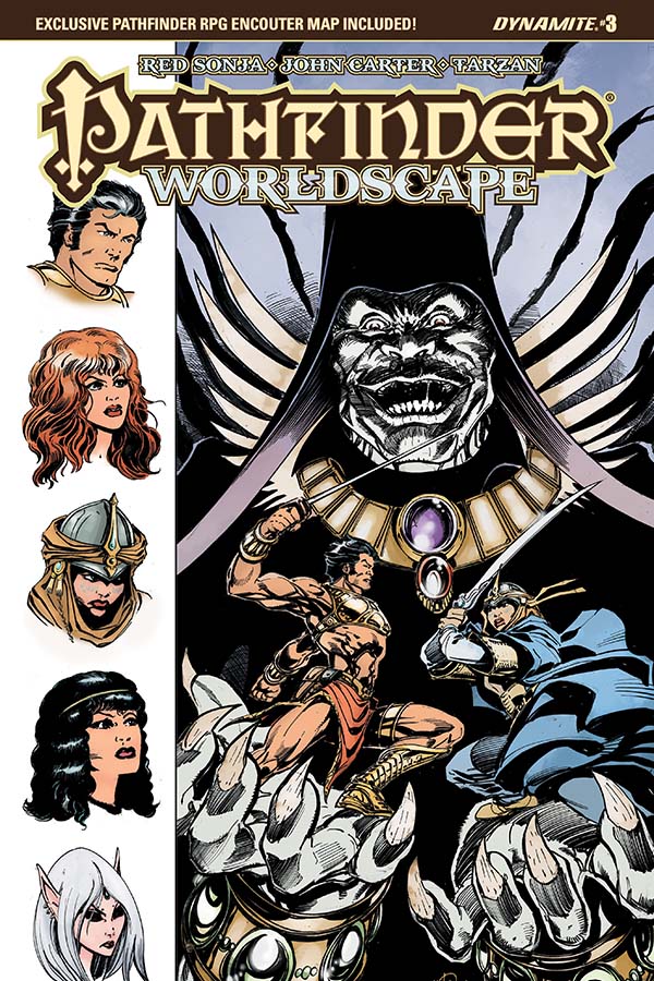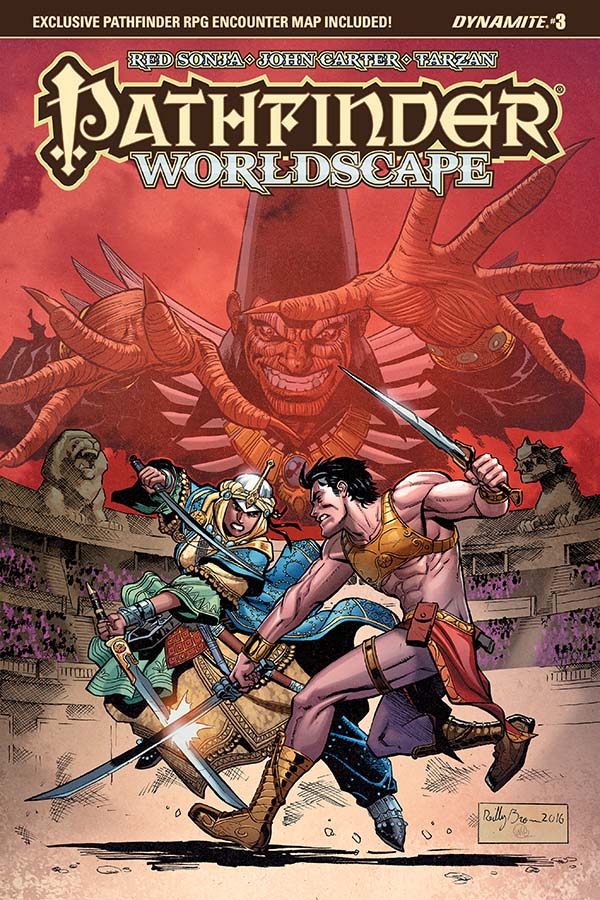 Kyra the cleric has been trapped in the Worldscape for seven days, a compassionate soul surrounded on all sides by liars, murderers, and thieves. When her heroics draw the attention of fellow dimensional fugitive John Carter of Mars, Kyra learns of potential allies who will ensure that she need not fight the darkness alone! Co-starring Red Sonja! The sides are drawn in the great battle between warriors of three worlds in a tale written by Pathfinder publisher Erik Mona (Pathfinder: Hollow Mountain) with art from Jonathan Lau (Red Sonja and Cub).