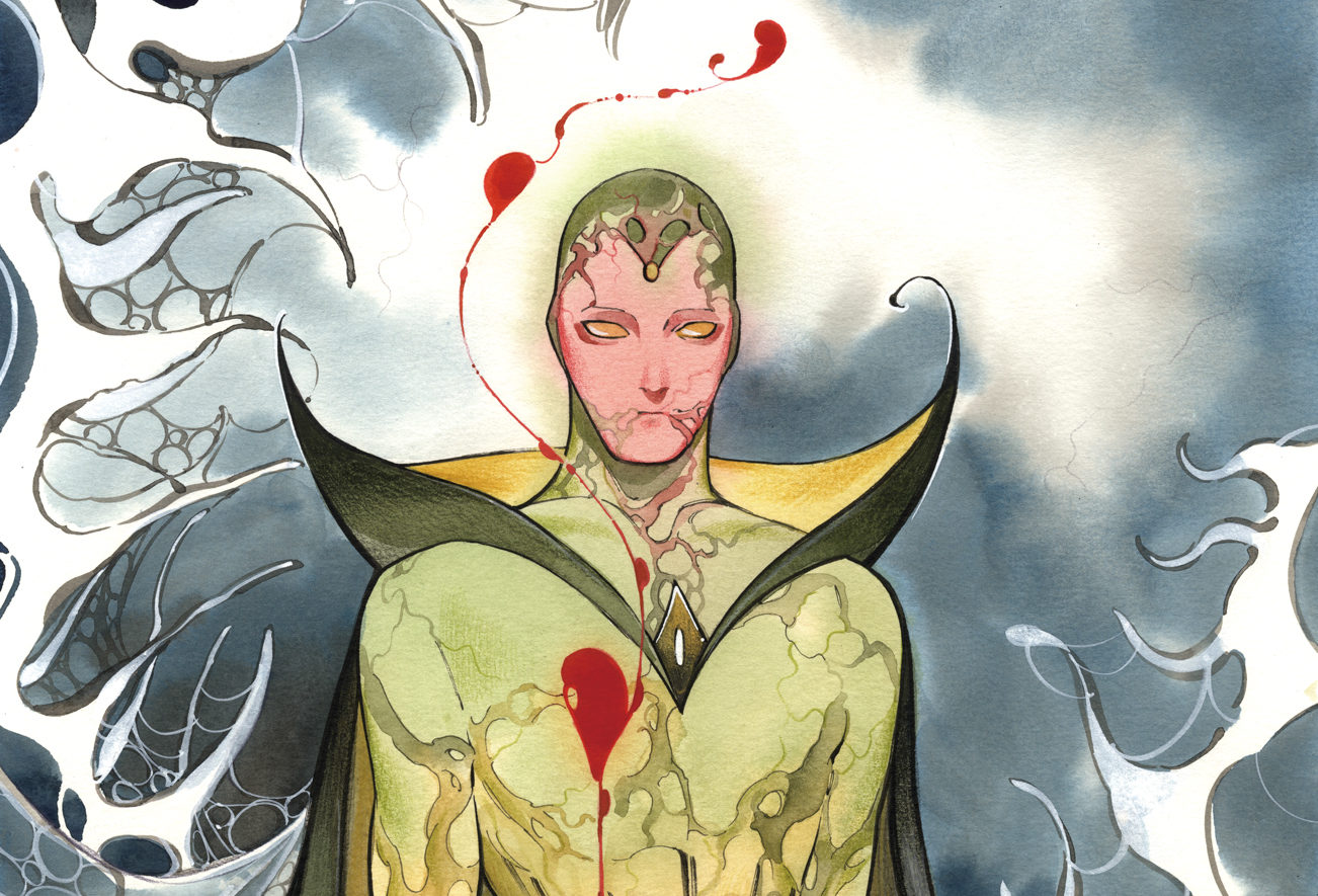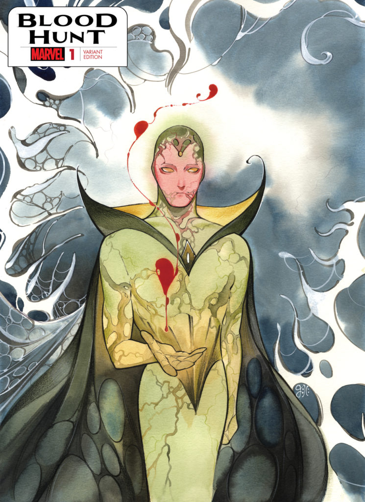 Today, fans can see visionary artist Peach Momoko’s haunting variant cover for BLOOD HUNT #1 spotlighting Vision! Currently serving as one of Earth’s Mightiest Heroes again in Jed MacKay’s hit run of Avengers, the powerful android will be one of the many doomed heroes on the frontlines of this vampiric war, trying desperately to stem the tide of blood to come!