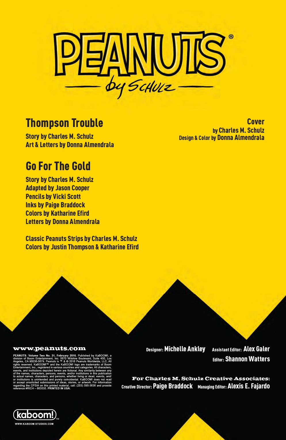 PreviewsBOOM! Studios Previews Peanuts #31 By Comix Asylum - Feb 23, 2016 0 645 FacebookTwitterPinterestWhatsApp Peanuts #31 Imprint: KaBOOM! Writers: Charles M. Schulz, Various Artists: Charles M. Schulz, Various In “Thompson Trouble,” Snoopy dons a moustache and rushes to help his pal Thompson, and Peppermint Patty is after a gold star in “Go for Gold.” Peanuts #31 1 of 7