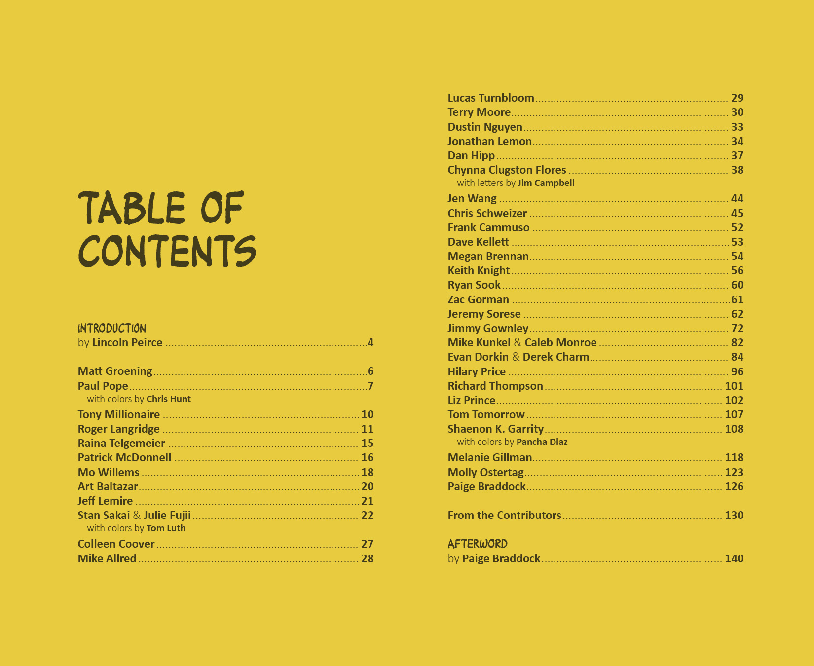 Writers/Artists: Mike Allred, Art Baltazar, Paige Braddock, Megan Brennan, Frank Cammuso, Derek Charm, Colleen Coover, Evan Dorkin, Chynna Clugston Flores, Julie Fujii, Shaenon K. Garrity, Melanie Gillman, Zac Gorman, Jimmy Gownley, Matt Groening, Dan Hipp, Keith Knight, Mike Kunkel, Roger Langridge, Jeff Lemire, Jonathan Lemon, Patrick McDonnell, Tony Millionaire, Caleb Monroe, Terry Moore, Dustin Nguyen, Molly Ostertag, Lincoln Peirce, Paul Pope, Hilary Price, Liz Prince, Stan Sakai, Chris Schweizer, Ryan Sook, Jeremy Sorese, Raina Telgemeier, Richard Thompson, Tom Tomorrow, Lucas Turnbloom, and Jen Wang