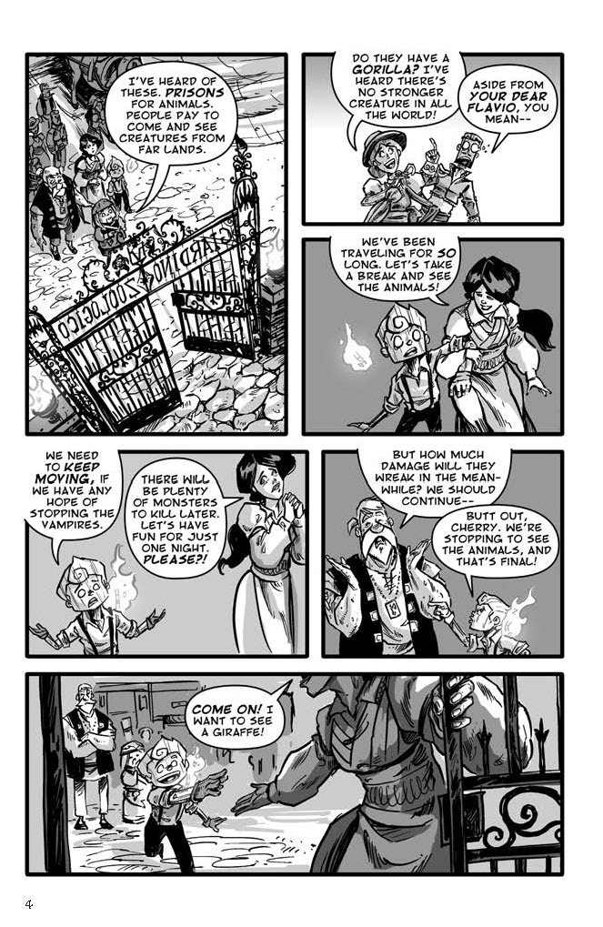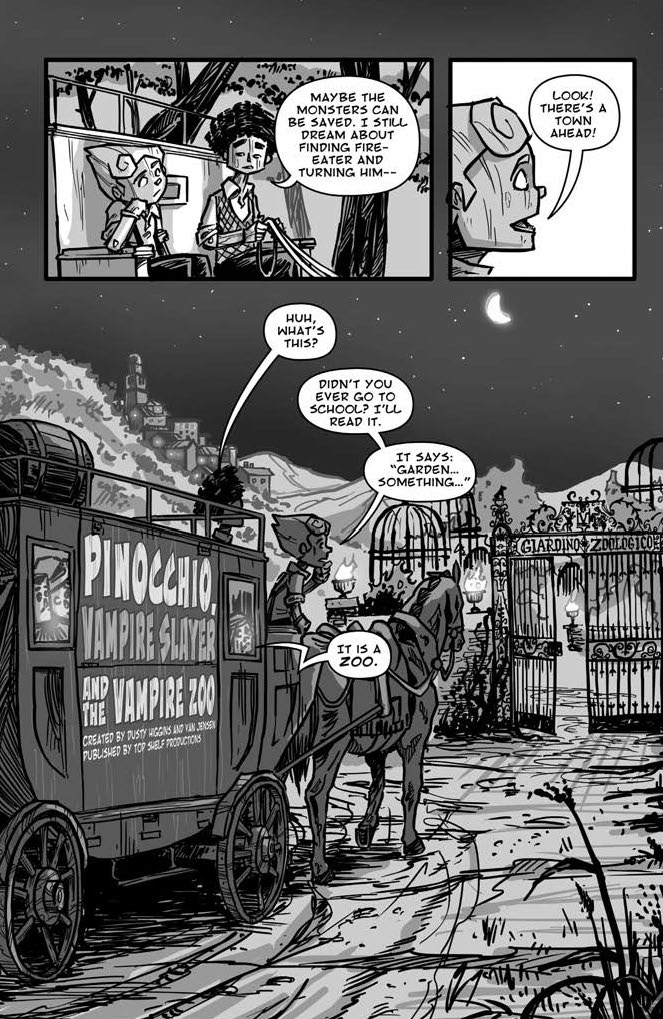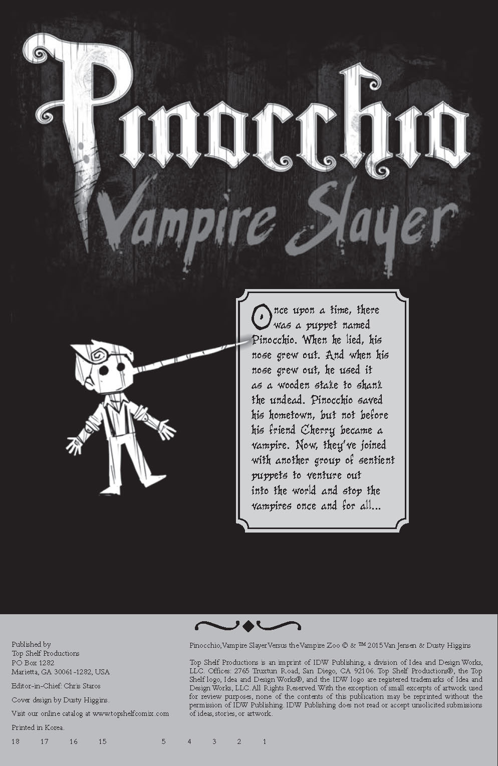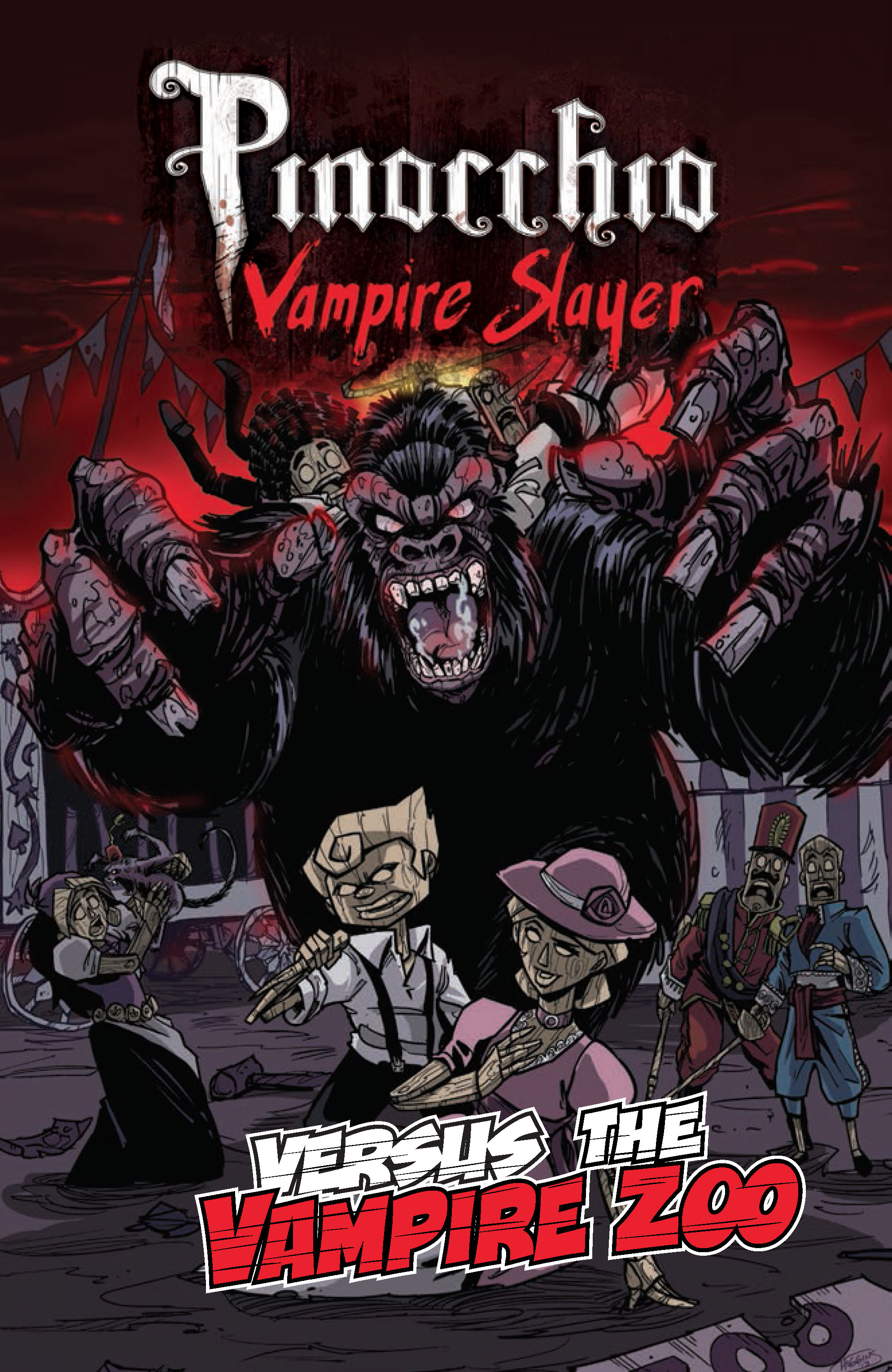 Venture back into the world of the acclaimed Pinocchio, Vampire Slayer in this brand-new adventure from creators Dusty Higgins (Knights of the Living Dead, Miles Taylor and the Golden Cape) and Van Jensen (The Flash, Green Lantern Corps). Pinocchio and his band of slayers are battling the undead across Italy when they come across a zoo and decide to take a break from the hunt. But the animals of this zoo have been infected by the vampiric curse. Now, the gang has to fight its way through hyenas, bats and one damn mean vampire gorilla to survive!