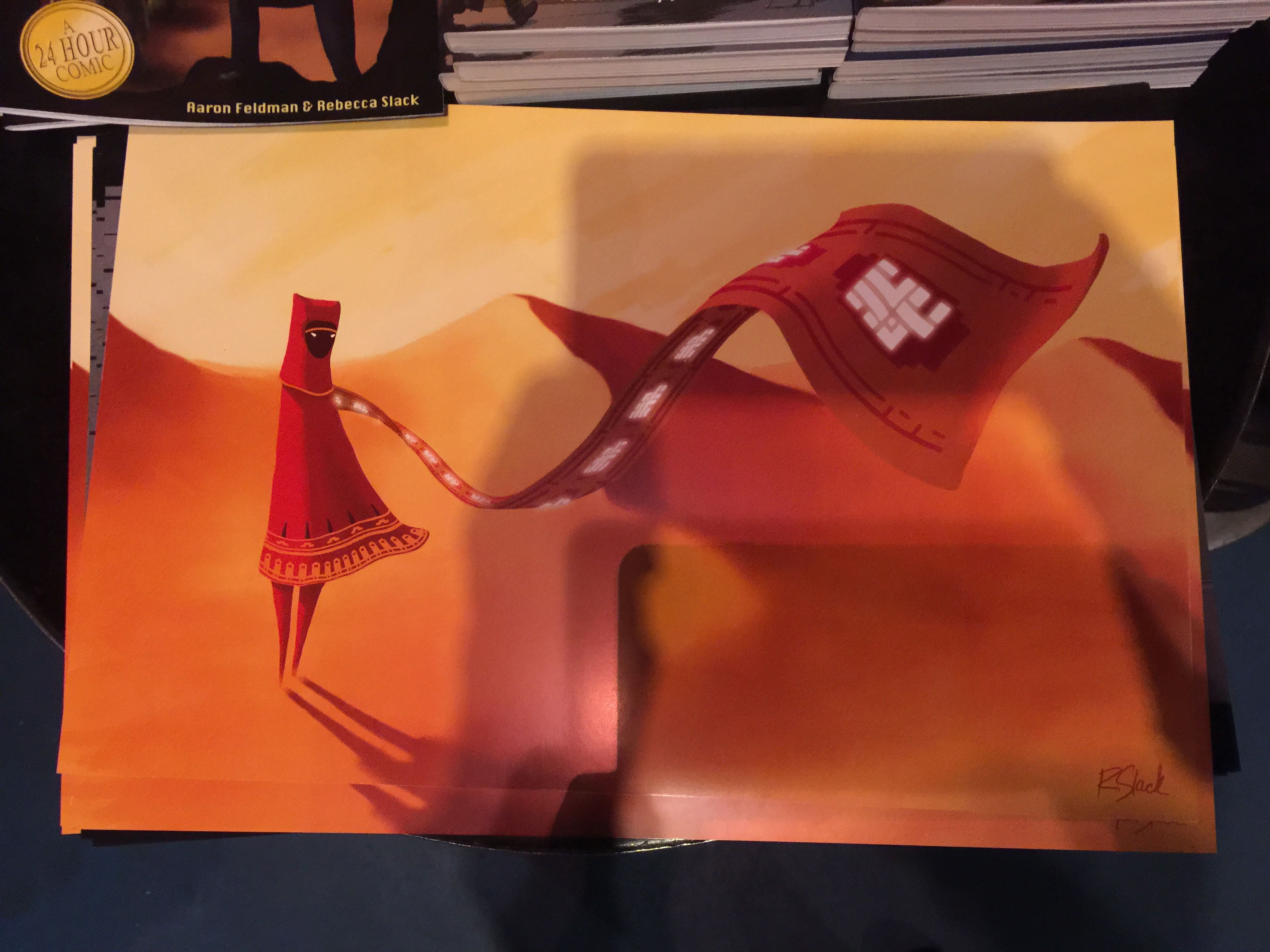 He was with his partner Rebecca Slack. I grilled her with several questions since it was our first time meeting. The two have produced a 24-hour comic book JET HUNTINGTON from two years ago. Rebecca had two prints for sale: a red-hooded character from a video game (the name escapes me) and various versions of Harley Quinn. Harley is always a major seller!!