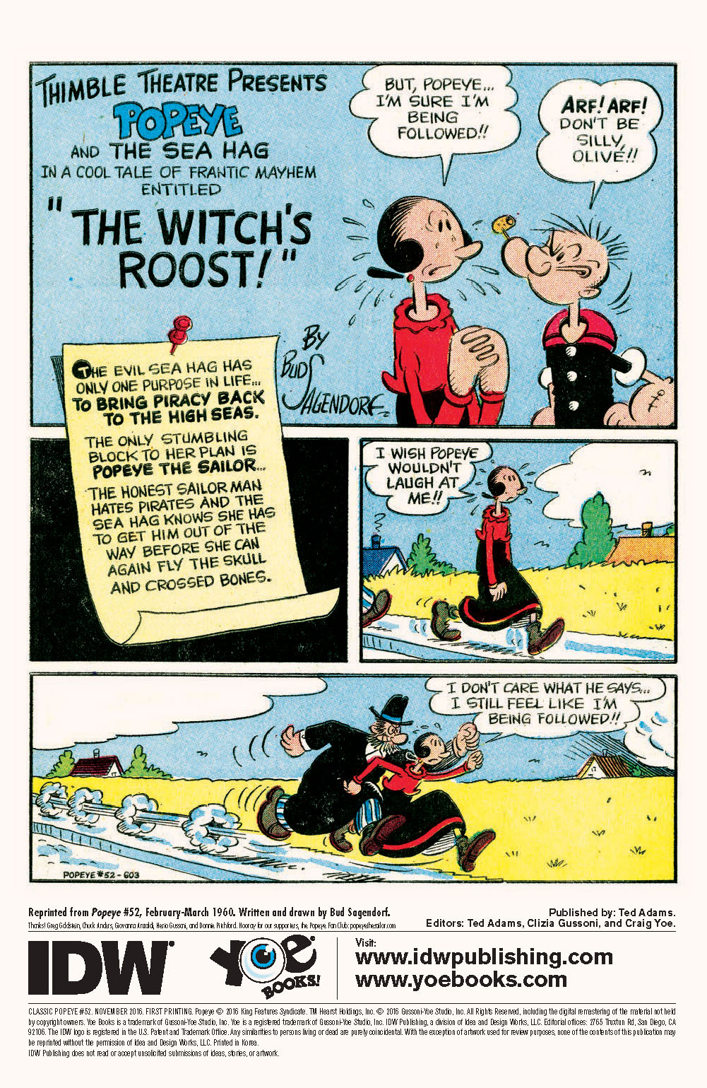 The world’s most brilliant Popeye cartoonist pits the one-eyed sailor against his most evil villain The Seahag in “The Witch’s Roost!” Plus raucous laff-filled comics with Swee’pea, Olive Oyl and O.G. Wotasnozzle!