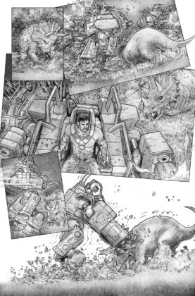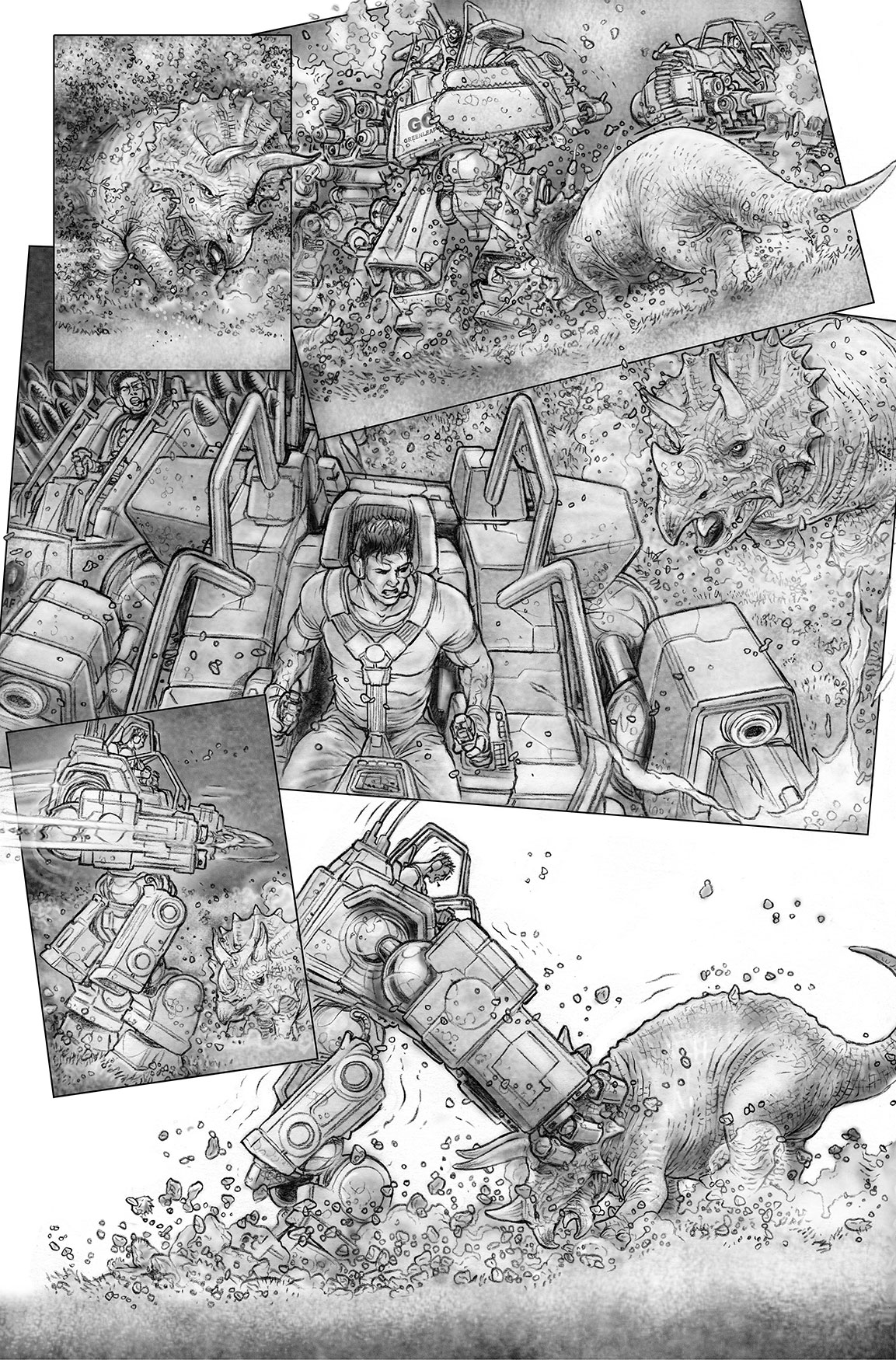 A: Time travel, cutting-edge mech armor, tough-guy roughnecks with a deep-seated grudge against dinosaurs, ethically debased oil executives, and, um, the horrors of evolution run amok?