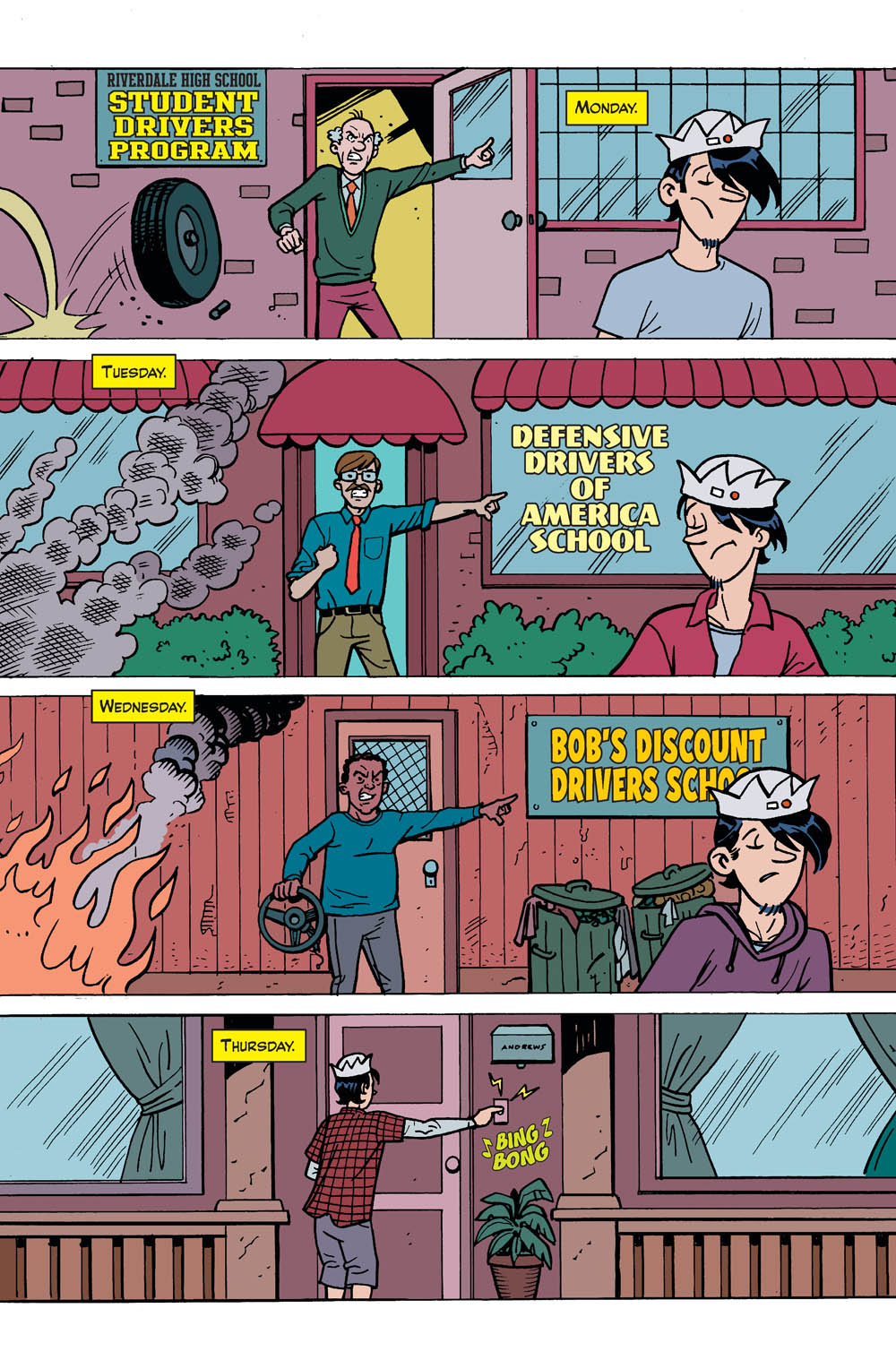 Classic-style Archie makes his return in this ALL-NEW, ALL-AGES comic from Ty Templeton and Dan Parent! Issue 1 features one of five connecting variant covers by Les McClaine. Collect them all to create one giant image of Pop’s Chock’lit Shop!