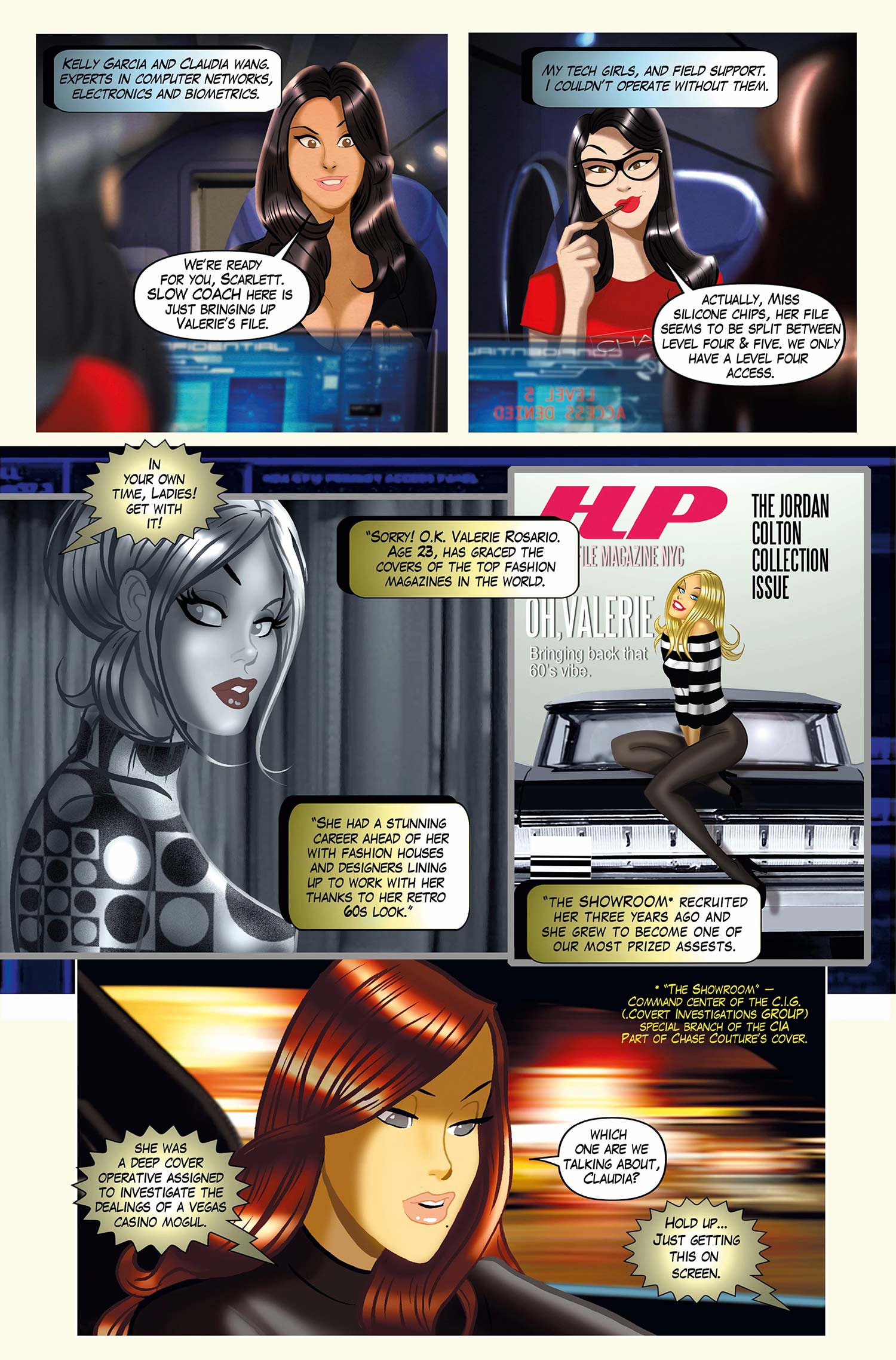 Using her cover as Head of Security for her mother’s internationally renowned fashion house, she gathers intelligence for the CIA. In this explosive first issue, Scarlett follows her instincts right into the middle of the action and finds she needs to use all her wits to get herself out of hot water!