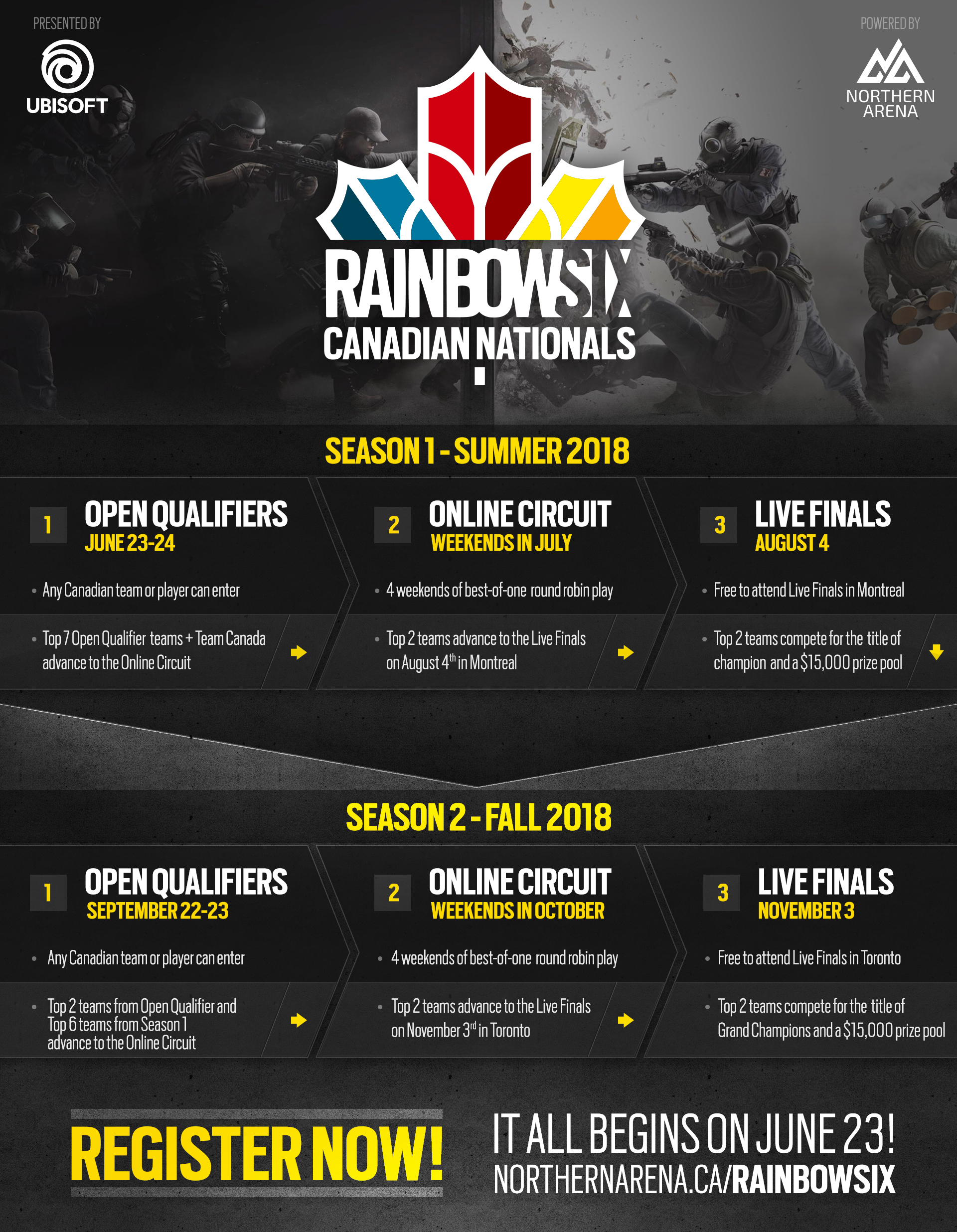 Presented by Ubisoft Canada and powered by Northern Arena, the Rainbow Six Canadian Nationals will kick off in June 2018. The competition will consist of two seasons, with live finals taking place in Montreal and Toronto. Each season, participating Canadian teams will compete for a $15,000 CAD prize pool.