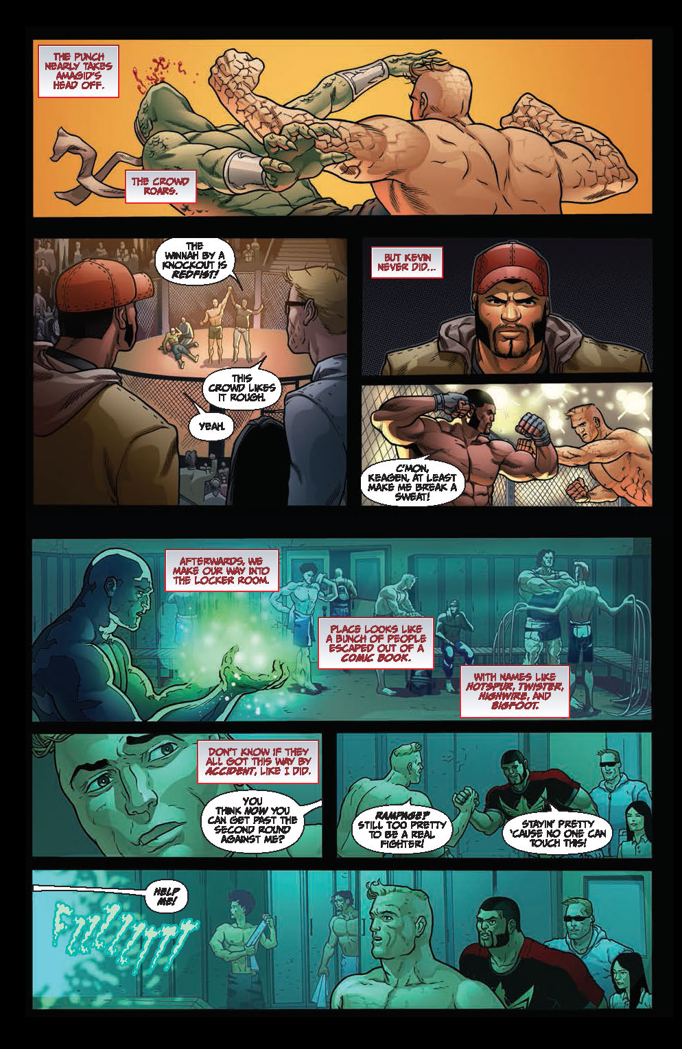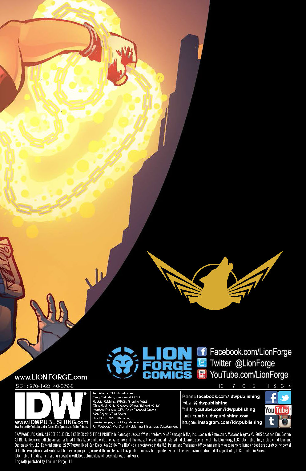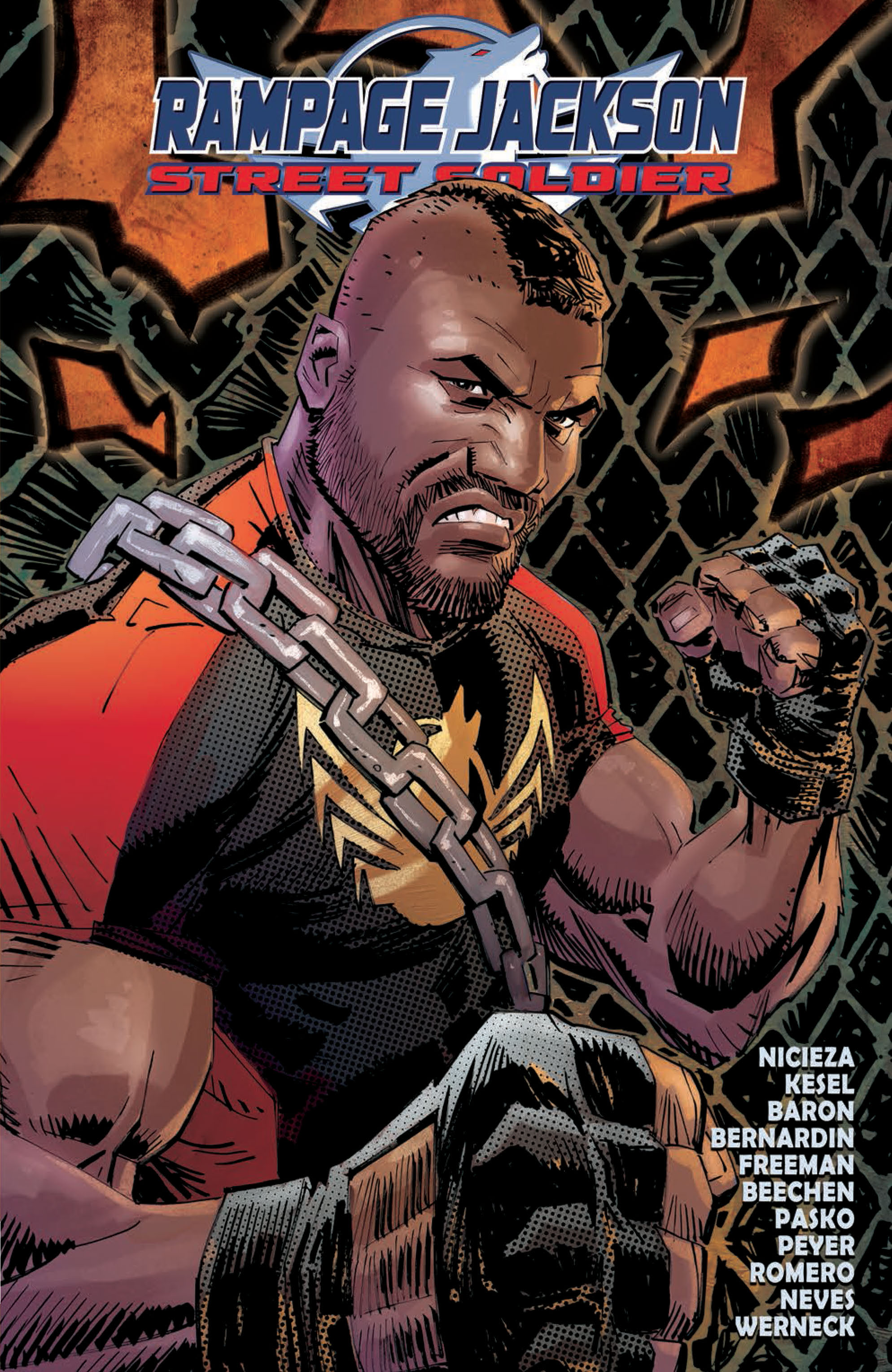 Rampage Jackson has touched the lives of millions, and when one of them reaches out for help against a terrible threat, he swings into action. With astonishing new super powers and his faithful dog, Andronicus, by his side, he must prepare for bone crunching throw downs in over-the-top adventures! An anthology of amazing self-contained stories, Rampage Jackson: Street Soldier marks the beginning of a bold new era of superhero fun!