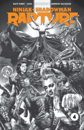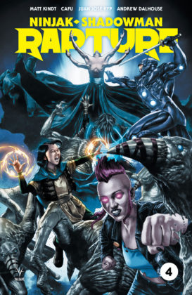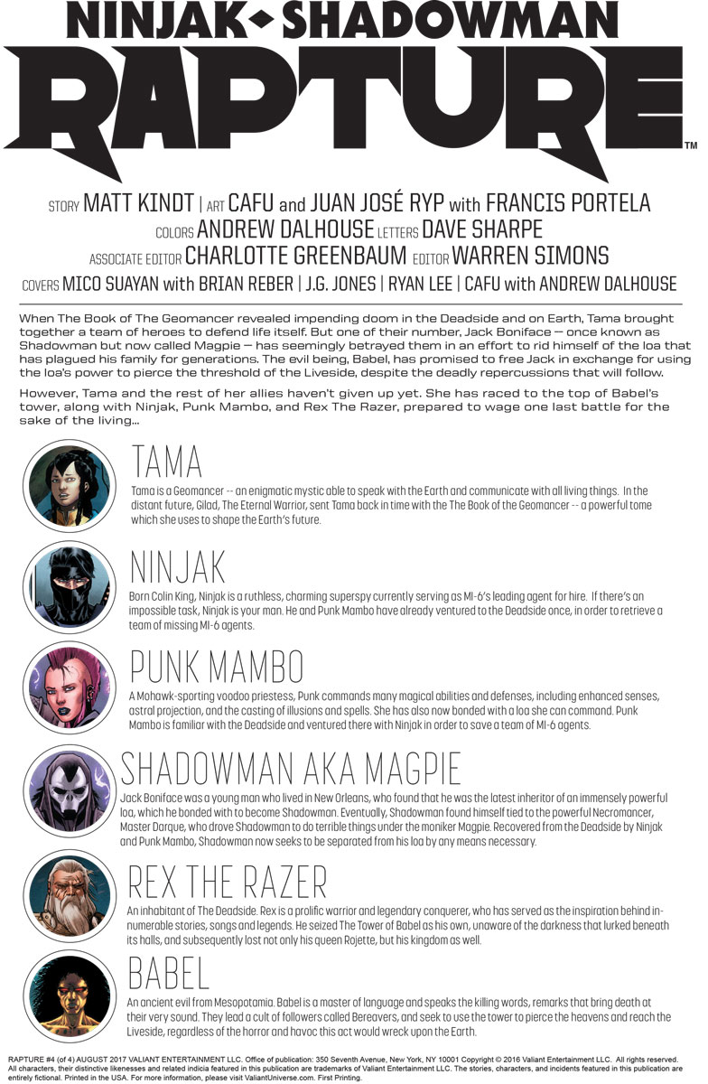 The final battle for life itself has arrived! As Babel makes its last assault on the heavenly realm beyond the Deadside, a band of Earth’s most dangerous heroes – Ninjak, Shadowman, Punk Mambo, and Tama the Geomancer – must halt its eons-old campaign once and for all…or face a global disaster of biblical proportions! Plus, at the center of it all: The undiscovered truth about Shadowman that will change the Valiant Universe forever!