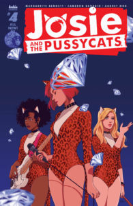 JOSIE AND THE PUSSYCATS #4The Pussycats’ careers really start to take off as they head off to Rome for glitz and glamour! But what happens when a gang of diamond thieves bursts onto the scene? And will Josie and Alan M’s dynamic sparkle under the heat and pressure of life on the road? Or will Josie’s hard-as-diamonds ambition CUT THEM ALL TO RIBBONS?! Find out in Issue 4, “THREE CATS BY A FOUNTAIN.”