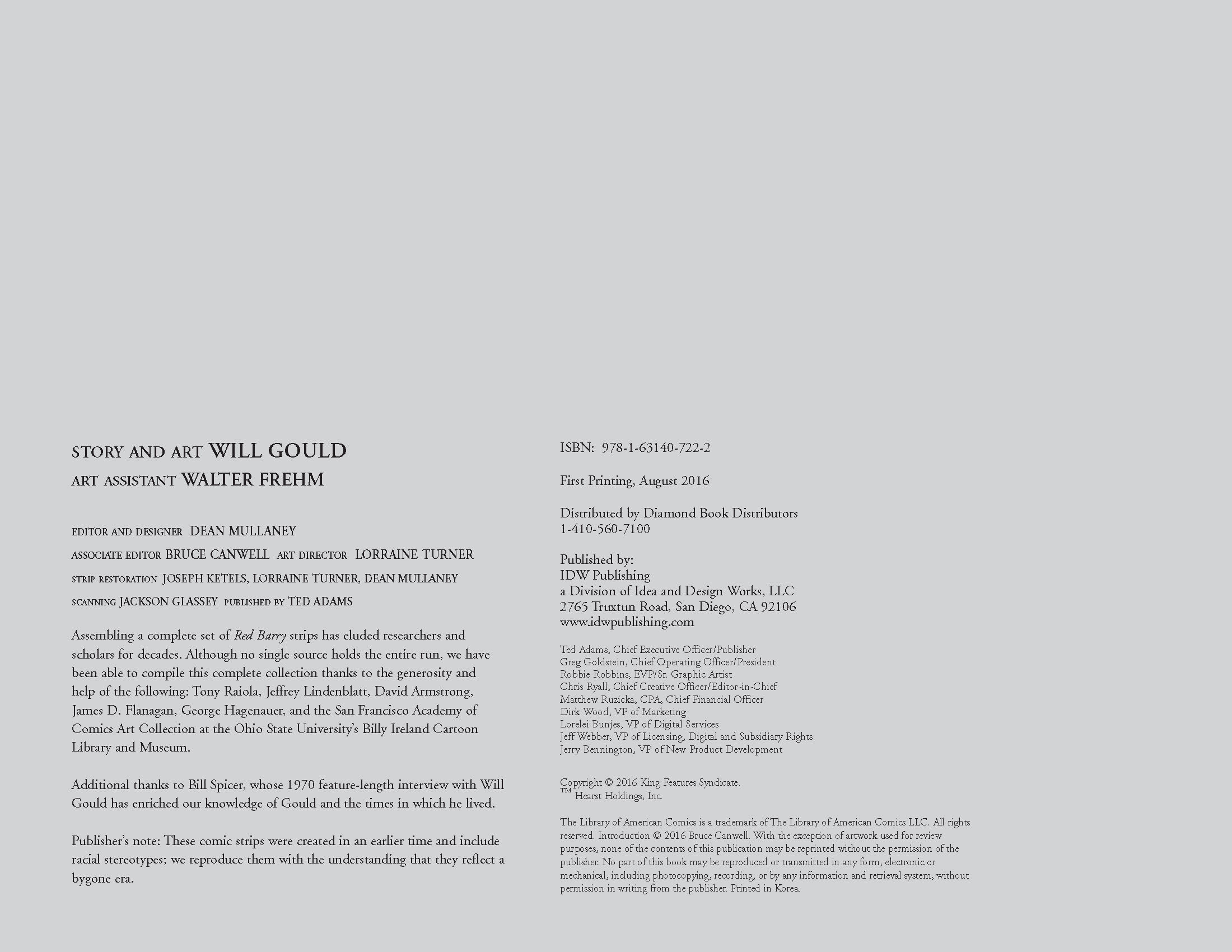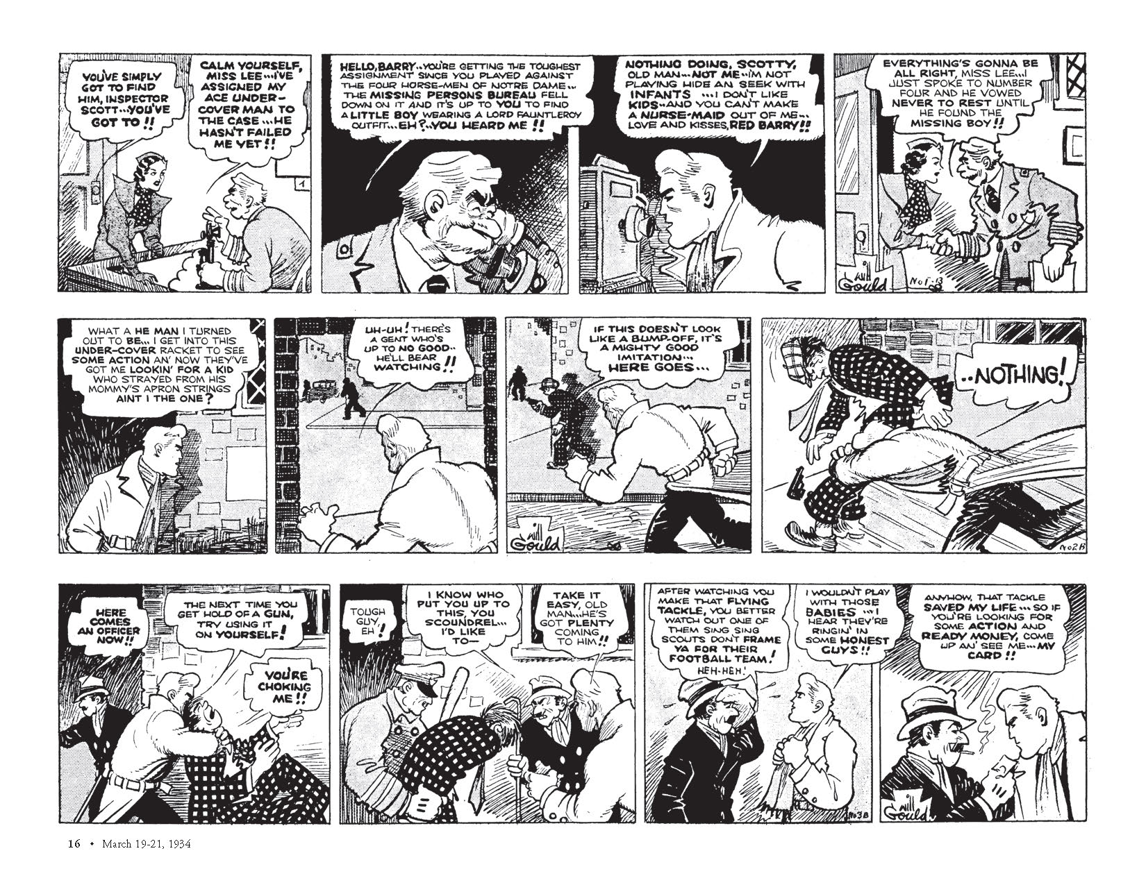 Red Barry was one of the most visually innovative adventure strips of the mid-1930s, combining fluid brushwork and noir shadows (in bold blues and purples) with figures that were constantly in motion, plus a level of violence that brought cries of protest from its syndicate. Red Barry and Secret Agent X-9 were King Features’ answers to the Tribune Syndicate’s popular Dick Tracy by Chester Gould. While X-9 continued for decades under hands of various quality, Red Barry by Will Gould (no relation to Chester) was an auteur’s vision that lasted less than four years (primarily because Gould couldn’t meet his deadlines). Regardless, it is today considered one of comics history’s great unsung masterpieces, one which famed mystery writer Anthony Boucher said was “the only detectives strip…worthy of any consideration from my scholarly viewpoint.” This two-volume series will reprint the complete dailies and color Sundays.