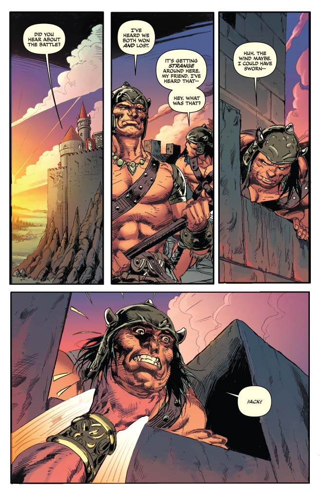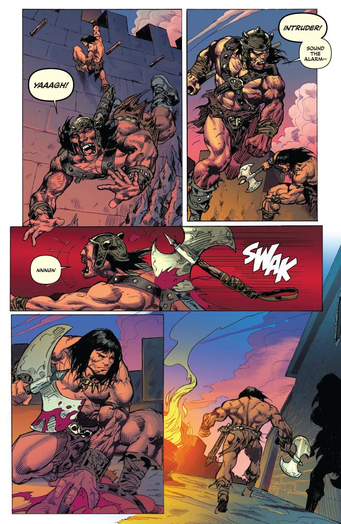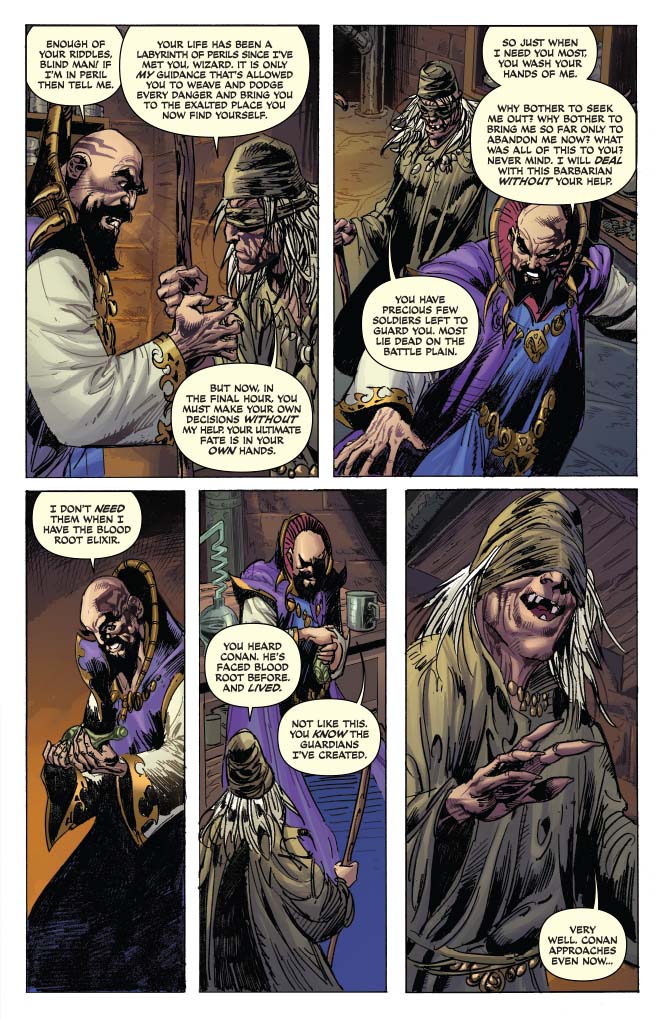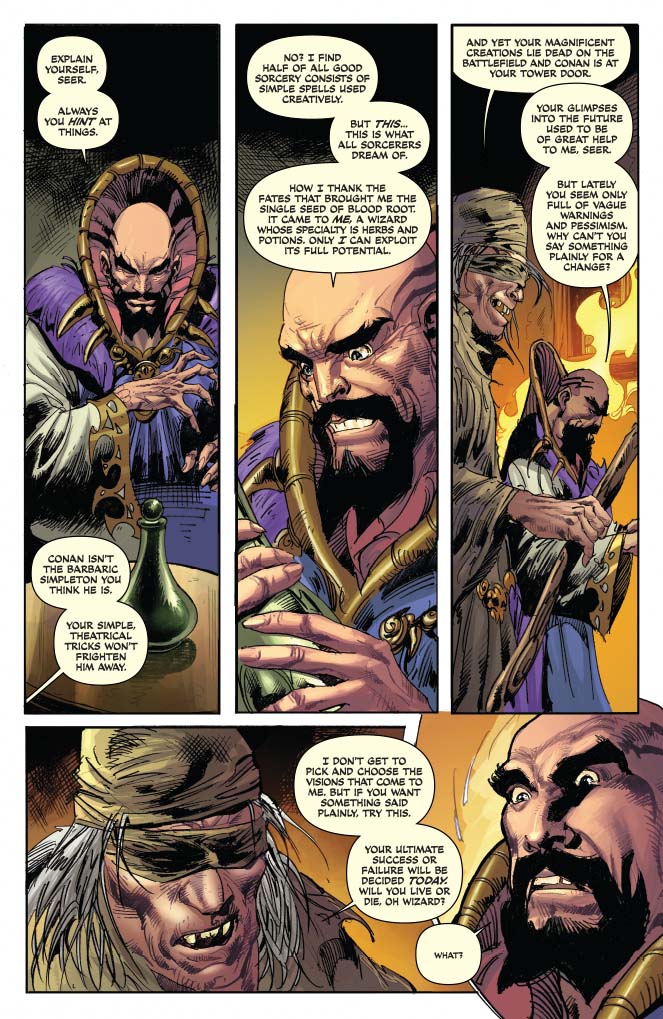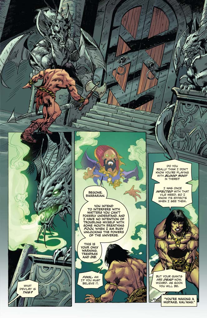 For years, the old blind Seer has helped the wizard Kal’Ang climb to power, but just when Kal’Ang needs him the most, the Seer tells the wizard he must now deal with a final threat on his own. What final threat? The wrath of Conan and Red Sonja of course. Recognizing that the scourge of blood root has risen again, the Cimmerian and the red haired hellion go after Kal’Ang with a vengeance. But what of the Seer and his secret motivations?