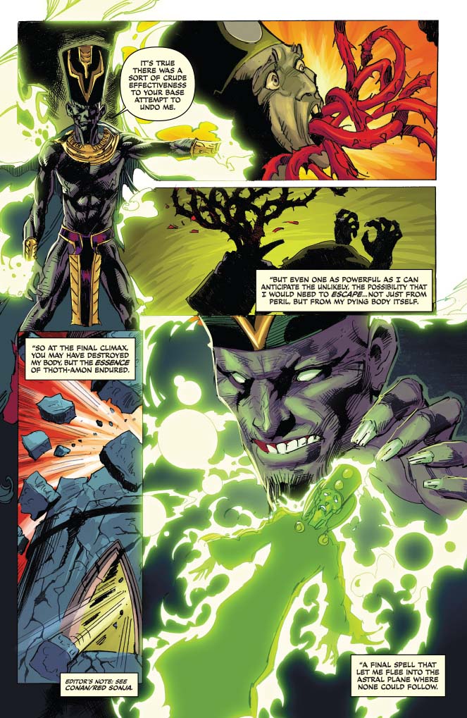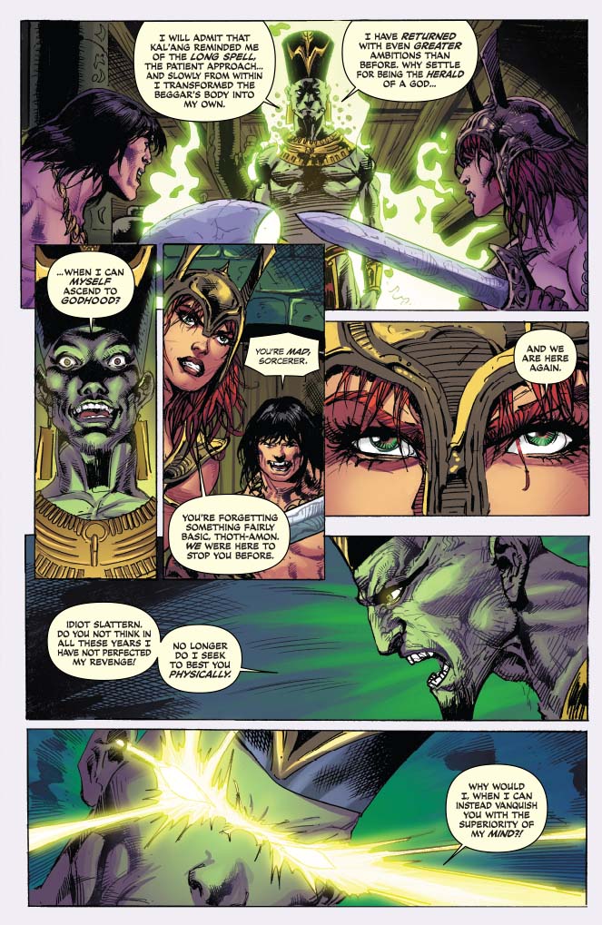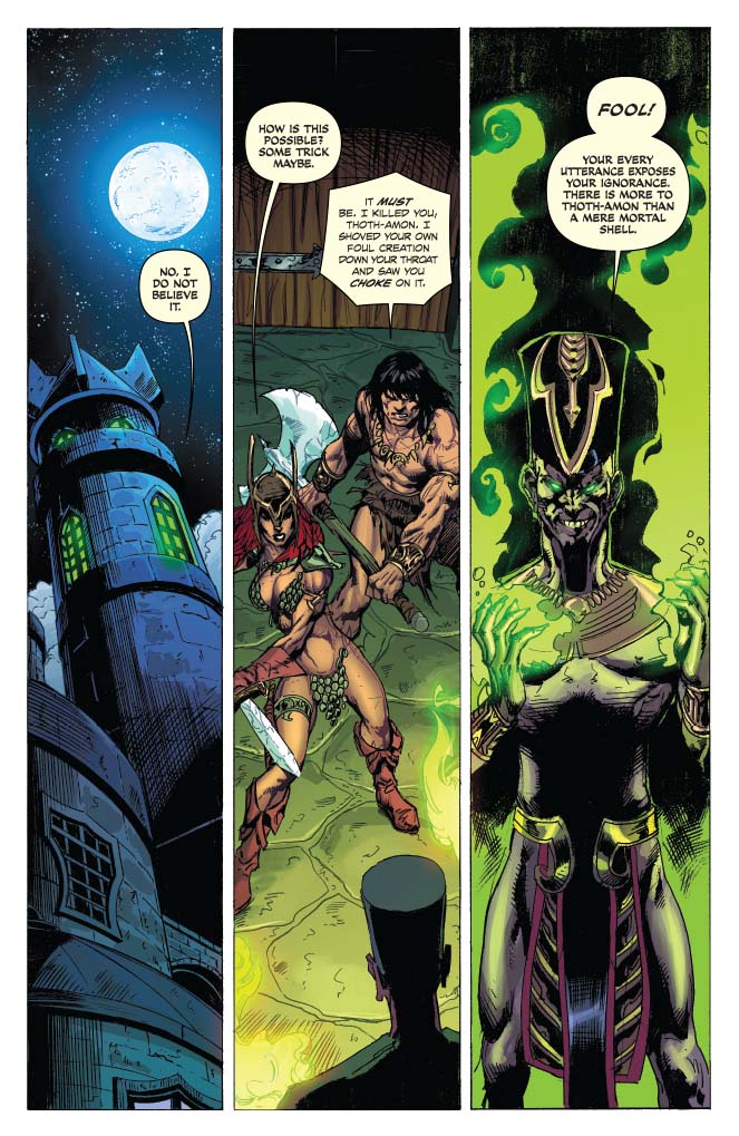 Red Sonja and Conan have stormed a fortress intent on finding and stopping the wizard Kal’Ang. They are startled to discover an even greater foe from their past. Can their willpower match the mind of a sorcerer? It will take more than speed and strength to save them this time, but the Cimmerian and the fire haired warrior women will never give up … even if asked to face down a god.